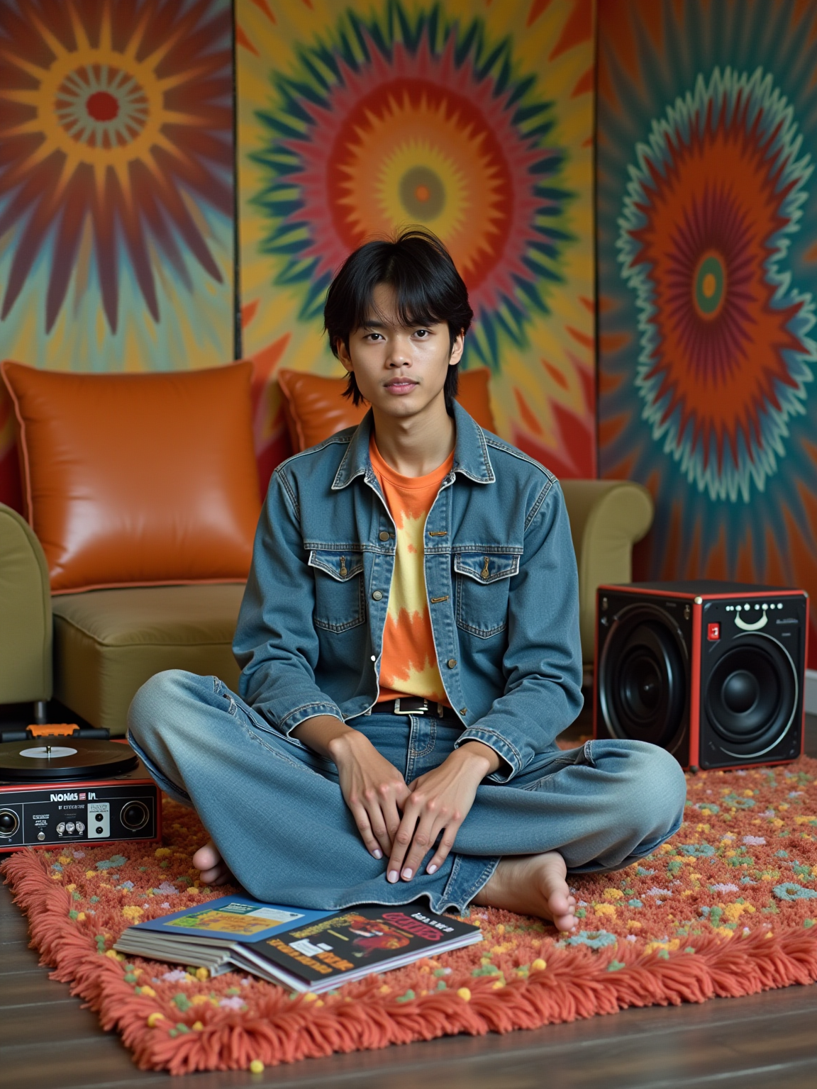 model sitting cross-legged on a colorful shag rug, wearing a denim jacket over tie-dye shirt with bell-bottom jeans, organizing a collection of Beatles and Motown singles, portable record player with detachable speakers nearby, inflatable furniture and psychedelic tapestries decorating the room