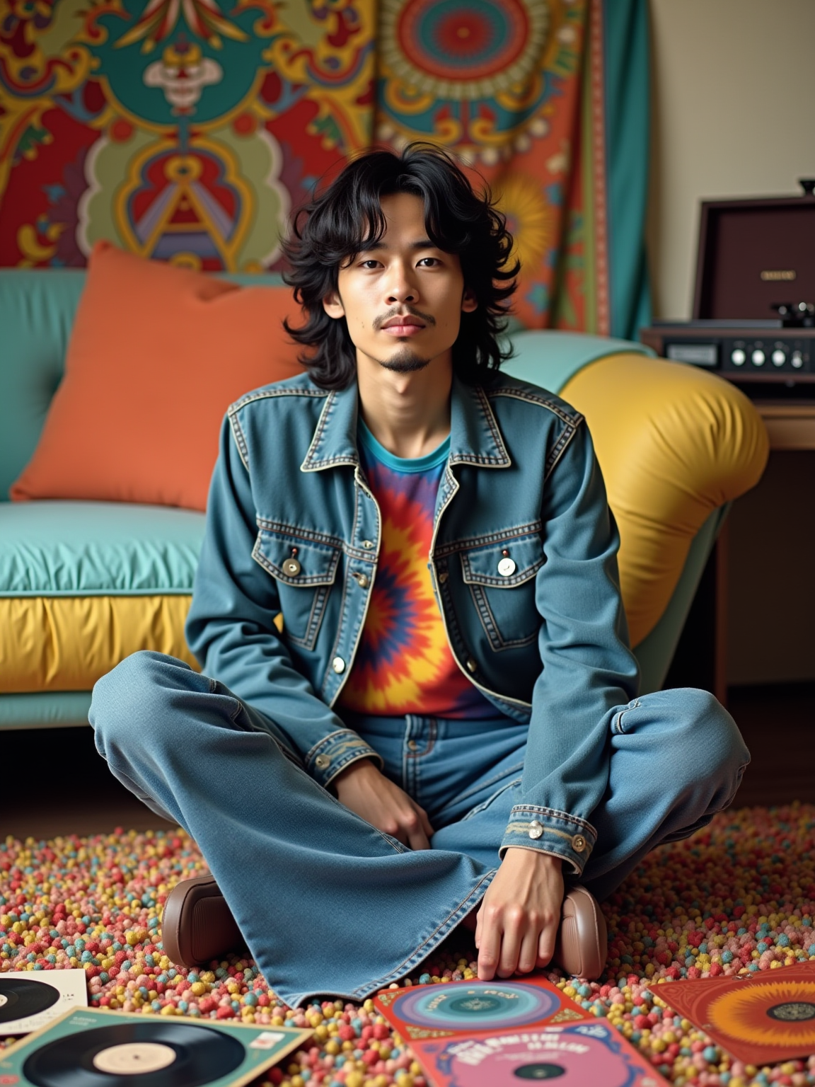model sitting cross-legged on a colorful shag rug, wearing a denim jacket over tie-dye shirt with bell-bottom jeans, organizing a collection of Beatles and Motown singles, portable record player with detachable speakers nearby, inflatable furniture and psychedelic tapestries decorating the room