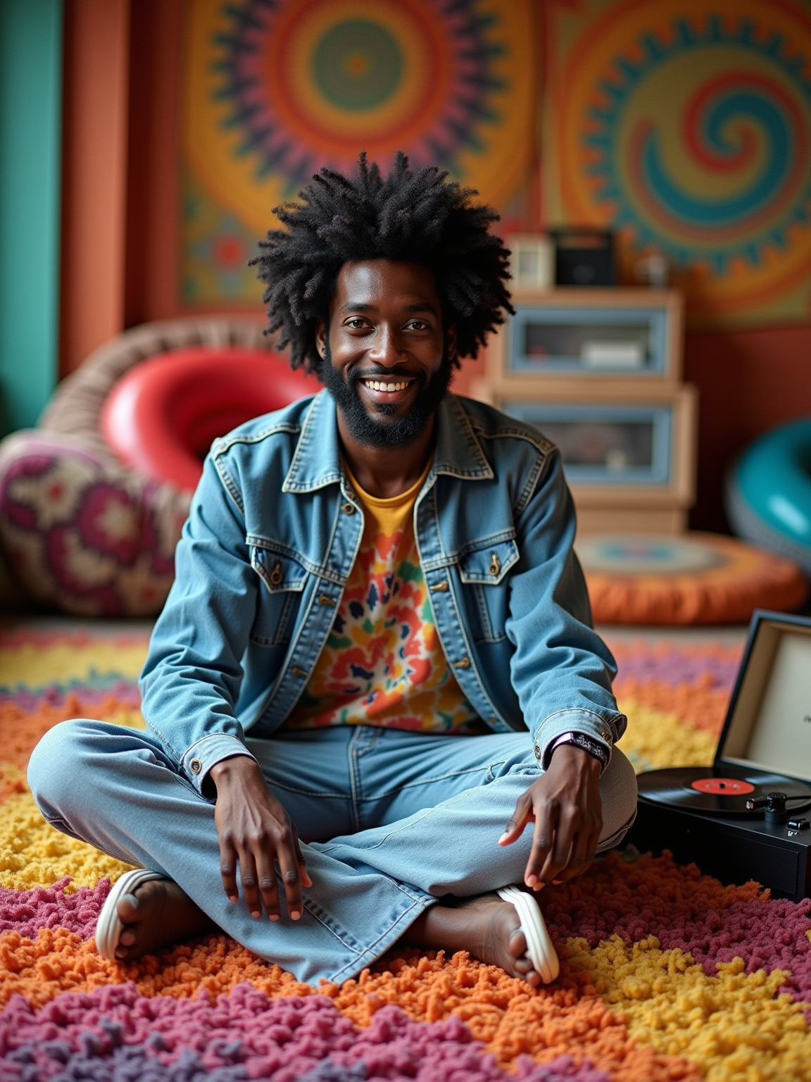 model sitting cross-legged on a colorful shag rug, wearing a denim jacket over tie-dye shirt with bell-bottom jeans, organizing a collection of Beatles and Motown singles, portable record player with detachable speakers nearby, inflatable furniture and psychedelic tapestries decorating the room