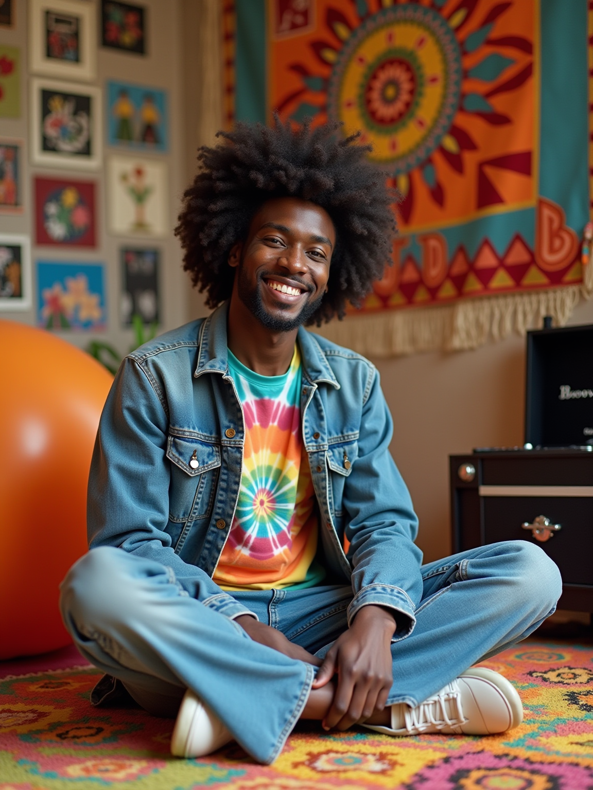 model sitting cross-legged on a colorful shag rug, wearing a denim jacket over tie-dye shirt with bell-bottom jeans, organizing a collection of Beatles and Motown singles, portable record player with detachable speakers nearby, inflatable furniture and psychedelic tapestries decorating the room