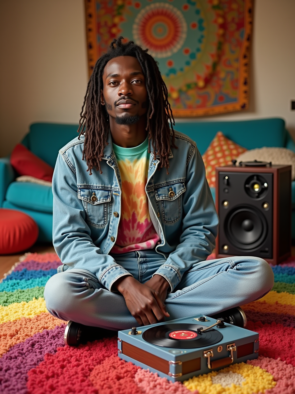 model sitting cross-legged on a colorful shag rug, wearing a denim jacket over tie-dye shirt with bell-bottom jeans, organizing a collection of Beatles and Motown singles, portable record player with detachable speakers nearby, inflatable furniture and psychedelic tapestries decorating the room