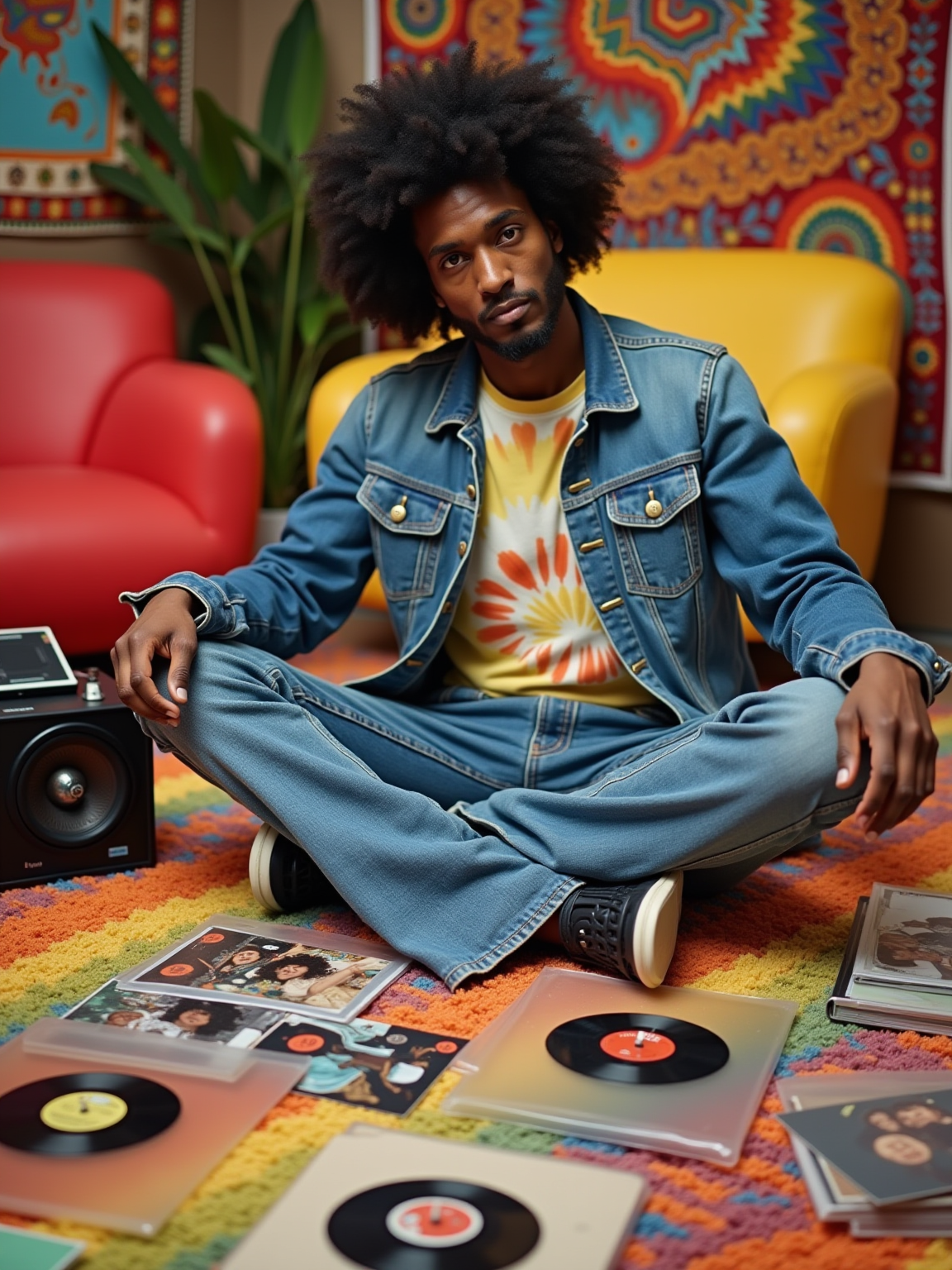 model sitting cross-legged on a colorful shag rug, wearing a denim jacket over tie-dye shirt with bell-bottom jeans, organizing a collection of Beatles and Motown singles, portable record player with detachable speakers nearby, inflatable furniture and psychedelic tapestries decorating the room