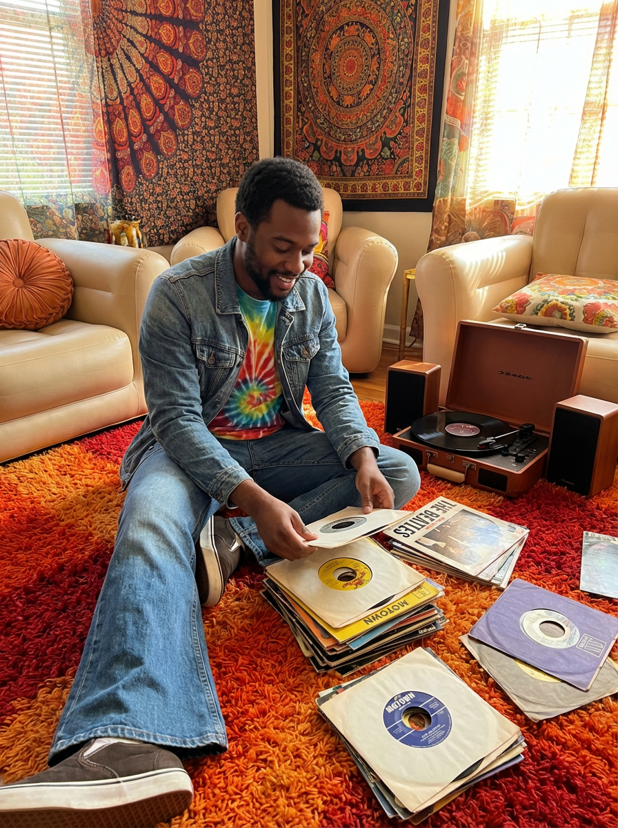 model sitting cross-legged on a colorful shag rug, wearing a denim jacket over tie-dye shirt with bell-bottom jeans, organizing a collection of Beatles and Motown singles, portable record player with detachable speakers nearby, inflatable furniture and psychedelic tapestries decorating the room