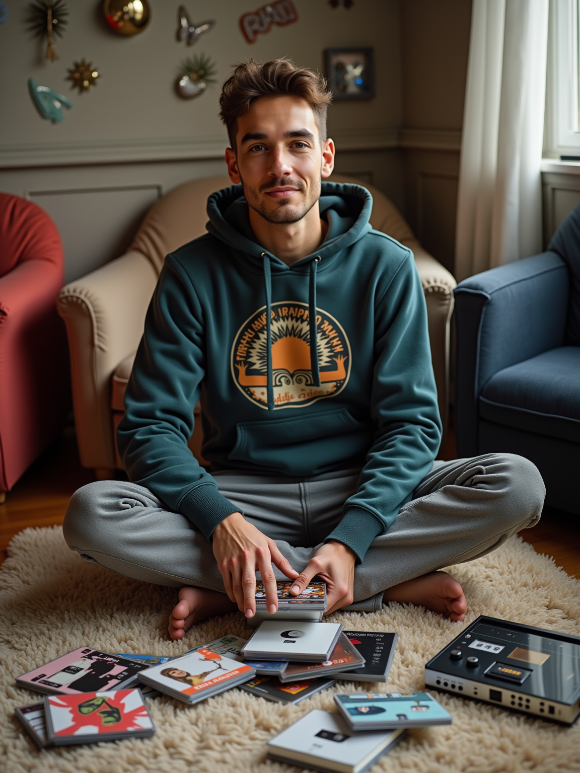 model sitting cross-legged on a fuzzy rug, wearing a graphic hoodie with sweatpants, organizing a collection of mix CDs and original albums, portable stereo with dual cassette deck nearby, inflatable chairs and metallic wall decals decorating the room