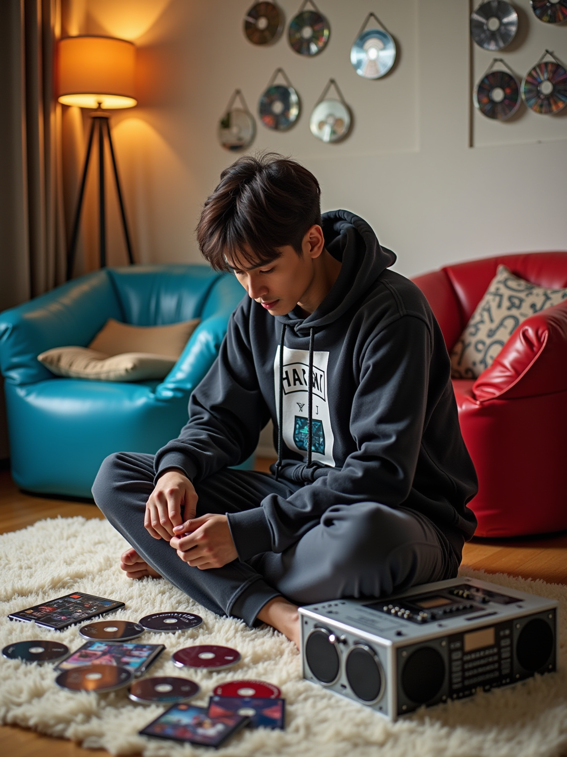 model sitting cross-legged on a fuzzy rug, wearing a graphic hoodie with sweatpants, organizing a collection of mix CDs and original albums, portable stereo with dual cassette deck nearby, inflatable chairs and metallic wall decals decorating the room