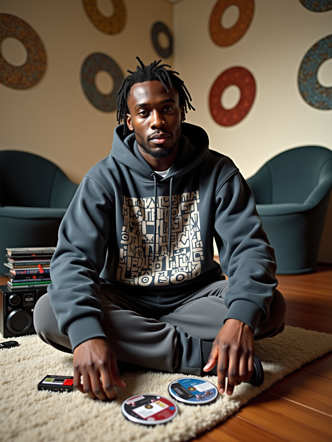 model sitting cross-legged on a fuzzy rug, wearing a graphic hoodie with sweatpants, organizing a collection of mix CDs and original albums, portable stereo with dual cassette deck nearby, inflatable chairs and metallic wall decals decorating the room