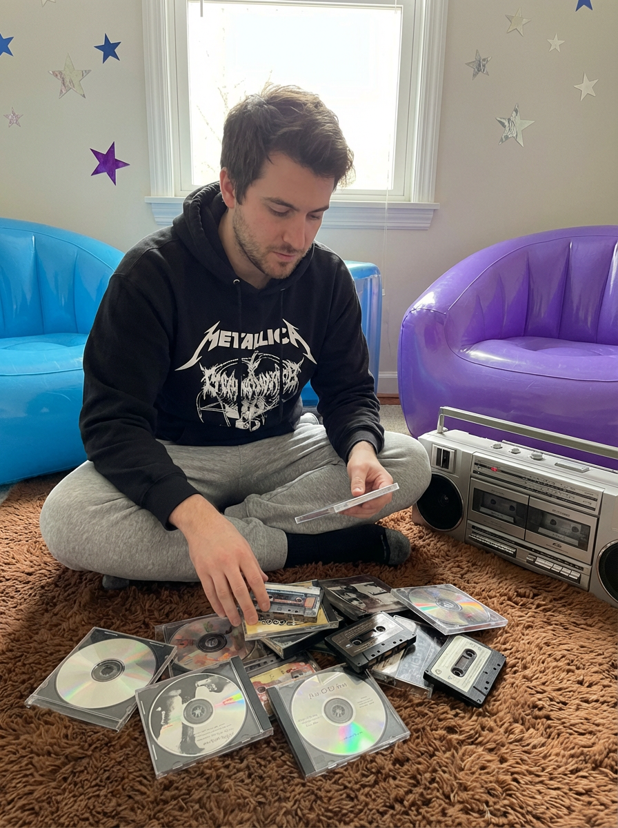 model sitting cross-legged on a fuzzy rug, wearing a graphic hoodie with sweatpants, organizing a collection of mix CDs and original albums, portable stereo with dual cassette deck nearby, inflatable chairs and metallic wall decals decorating the room
