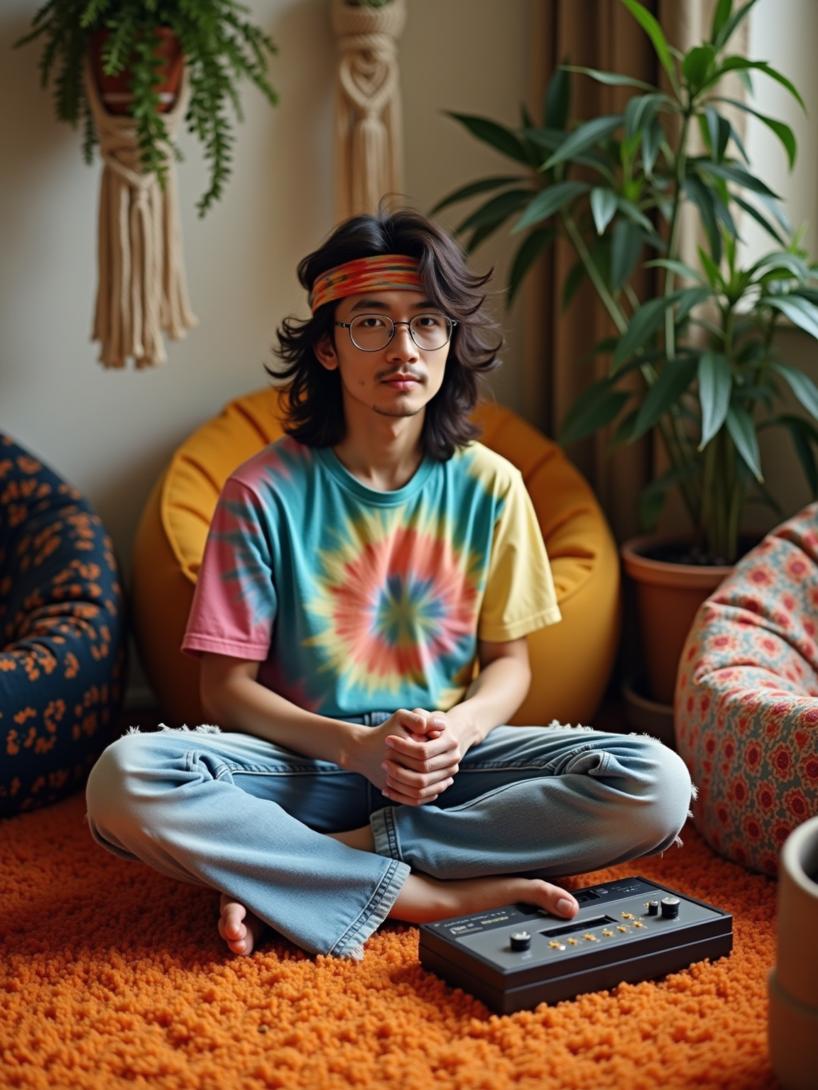 model sitting cross-legged on orange shag carpet, wearing tie-dye shirt with frayed jeans and headband, organizing a collection of vinyl LPs and 45s, portable stereo with cassette deck nearby, bean bag chairs and hanging macramé planters decorating the room