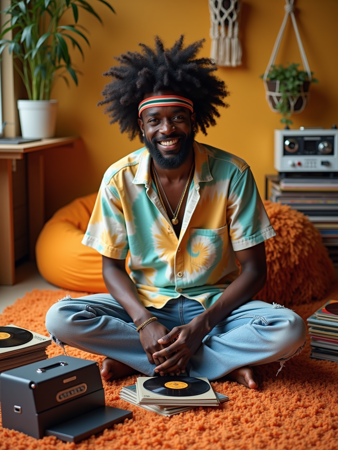 model sitting cross-legged on orange shag carpet, wearing tie-dye shirt with frayed jeans and headband, organizing a collection of vinyl LPs and 45s, portable stereo with cassette deck nearby, bean bag chairs and hanging macramé planters decorating the room