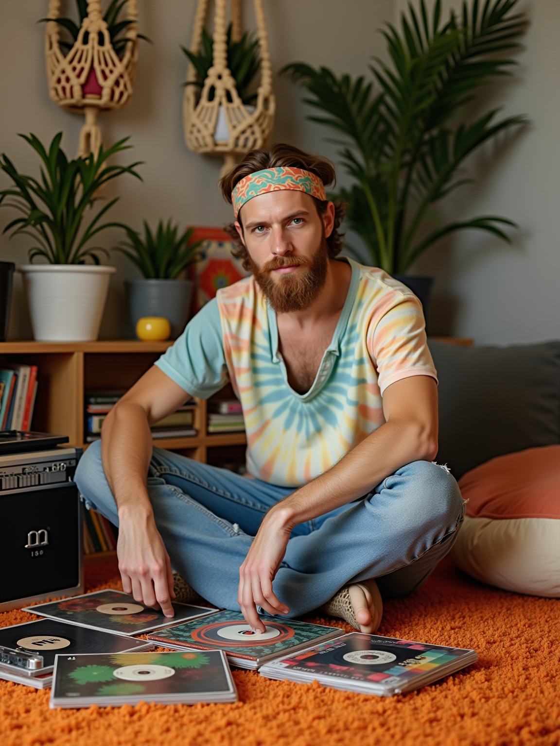 model sitting cross-legged on orange shag carpet, wearing tie-dye shirt with frayed jeans and headband, organizing a collection of vinyl LPs and 45s, portable stereo with cassette deck nearby, bean bag chairs and hanging macramé planters decorating the room