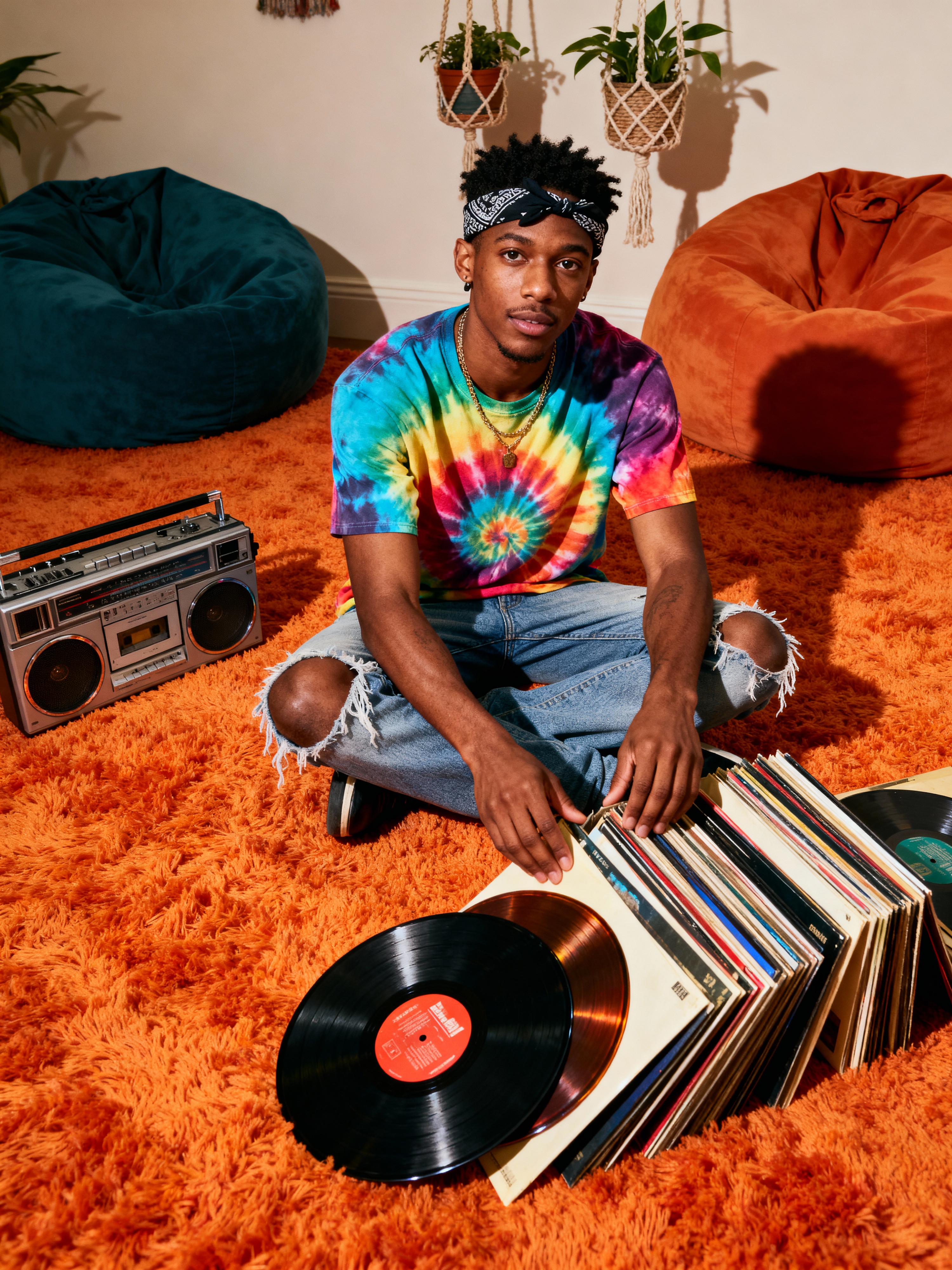 model sitting cross-legged on orange shag carpet, wearing tie-dye shirt with frayed jeans and headband, organizing a collection of vinyl LPs and 45s, portable stereo with cassette deck nearby, bean bag chairs and hanging macramé planters decorating the room