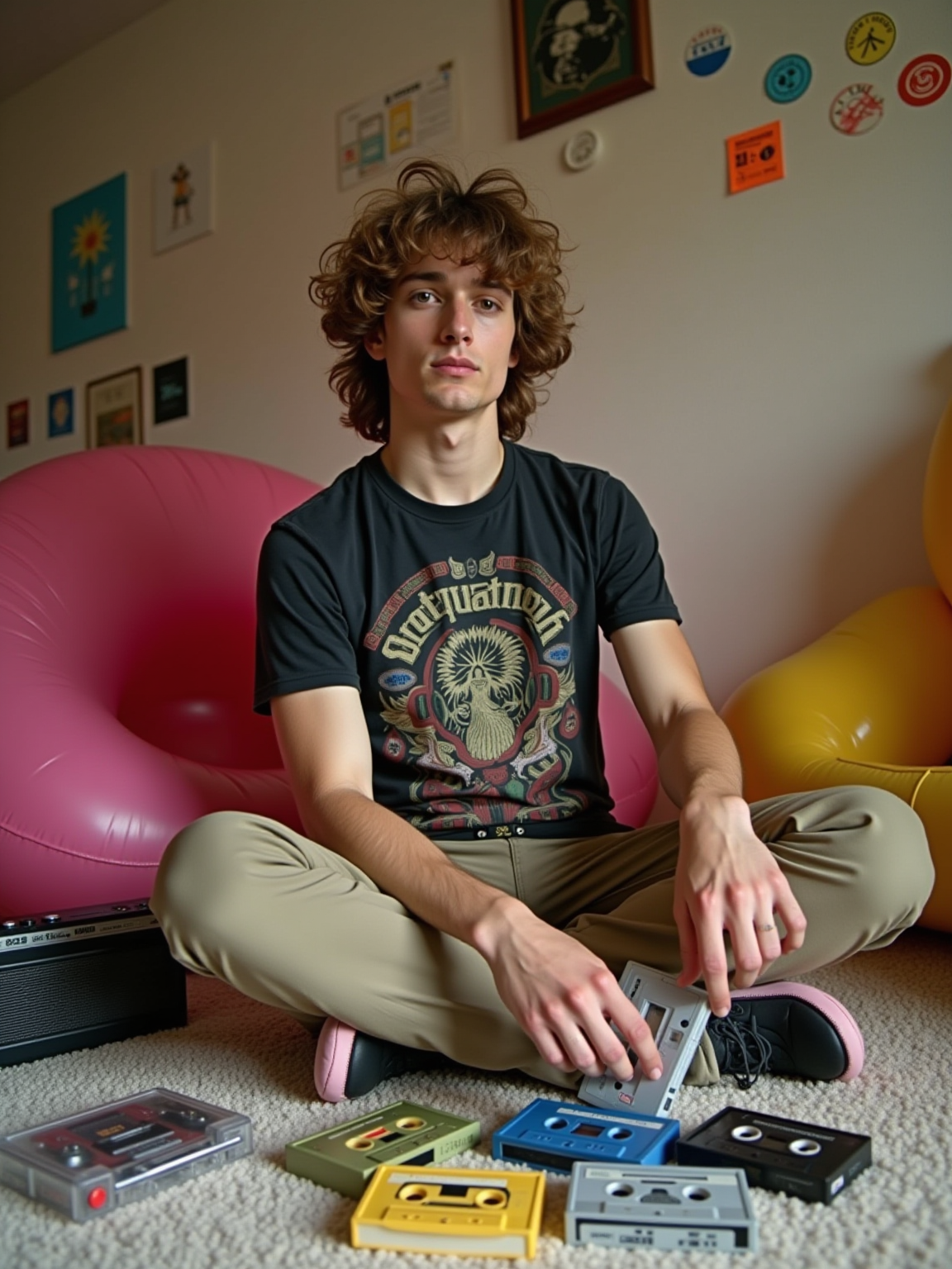 model sitting cross-legged on shag carpet, wearing frosted tips hairstyle, a graphic tee, and khaki pants, organizing a collection of cassette singles, portable radio nearby, inflatable furniture and holographic stickers decorating the room