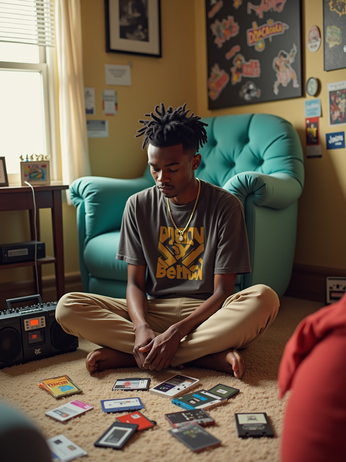model sitting cross-legged on shag carpet, wearing frosted tips hairstyle, a graphic tee, and khaki pants, organizing a collection of cassette singles, portable radio nearby, inflatable furniture and holographic stickers decorating the room