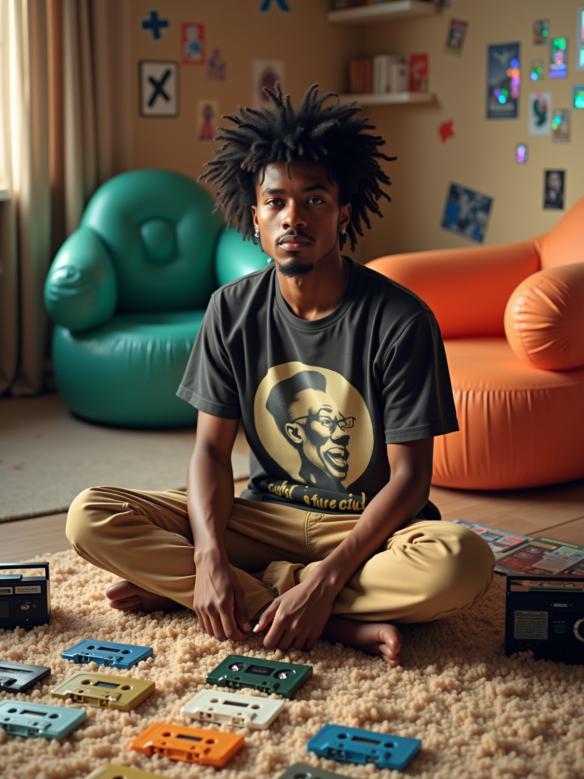 model sitting cross-legged on shag carpet, wearing frosted tips hairstyle, a graphic tee, and khaki pants, organizing a collection of cassette singles, portable radio nearby, inflatable furniture and holographic stickers decorating the room