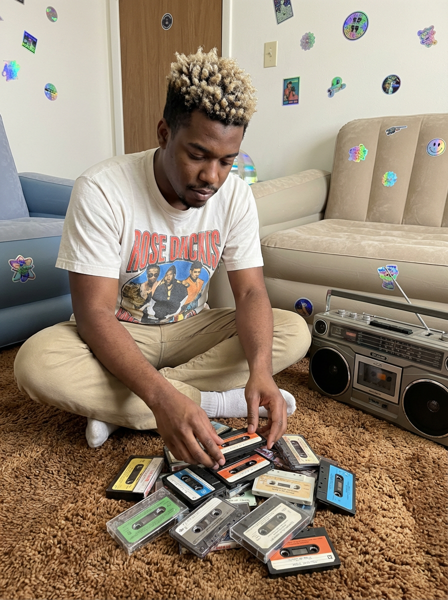model sitting cross-legged on shag carpet, wearing frosted tips hairstyle, a graphic tee, and khaki pants, organizing a collection of cassette singles, portable radio nearby, inflatable furniture and holographic stickers decorating the room