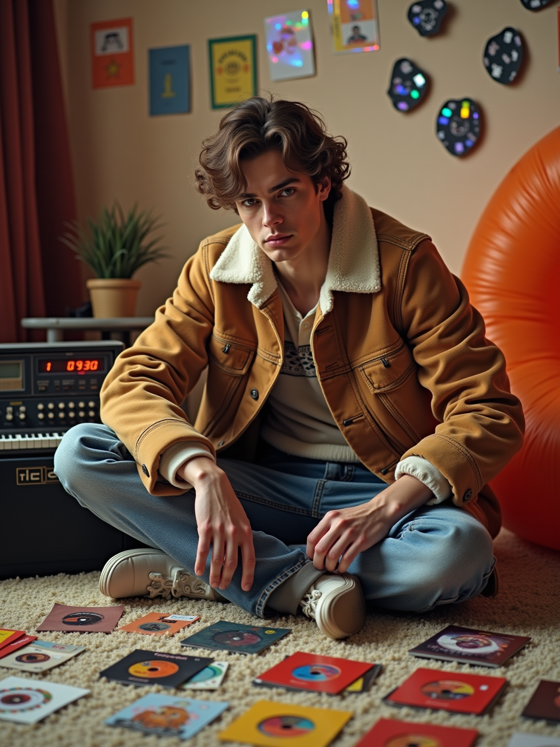 model sitting cross-legged on shag carpet, wearing Members Only jacket with popped collar and stonewashed jeans, organizing a collection of 45 RPM singles, portable radio with digital display nearby, inflatable furniture and holographic stickers decorating the room