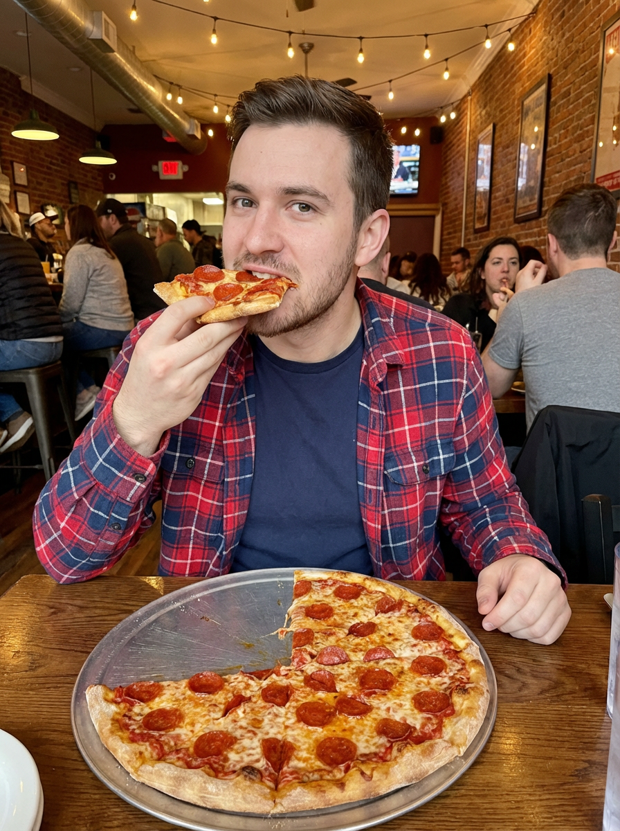 model sitting in a restaurant eating a large pizza