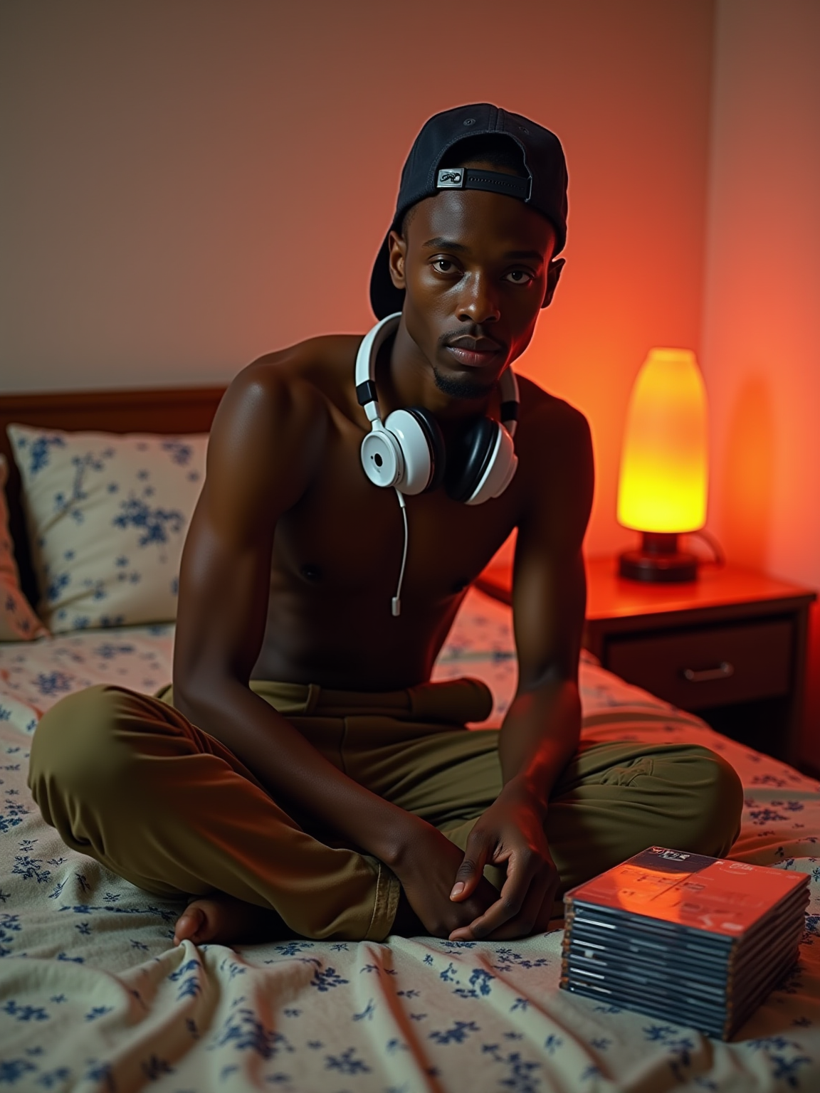 model sitting on a bed covered with a geometric patterned comforter, wearing cargo pants and a backwards baseball cap, holding a portable CD player with headphones around neck, stack of CD jewel cases nearby, lava lamp glowing in the corner