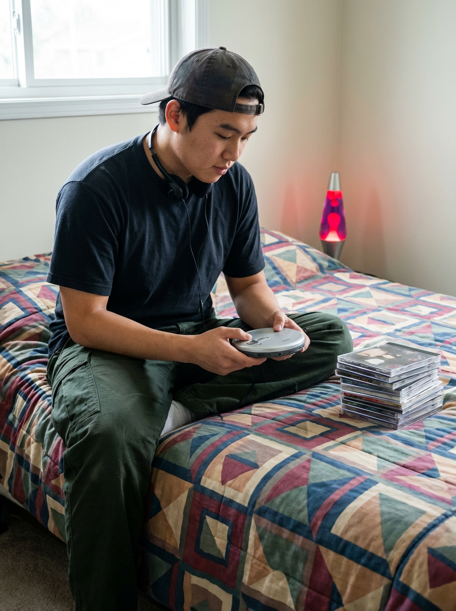 model sitting on a bed covered with a geometric patterned comforter, wearing cargo pants and a backwards baseball cap, holding a portable CD player with headphones around neck, stack of CD jewel cases nearby, lava lamp glowing in the corner