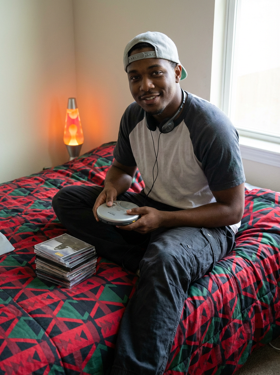 model sitting on a bed covered with a geometric patterned comforter, wearing cargo pants and a backwards baseball cap, holding a portable CD player with headphones around neck, stack of CD jewel cases nearby, lava lamp glowing in the corner