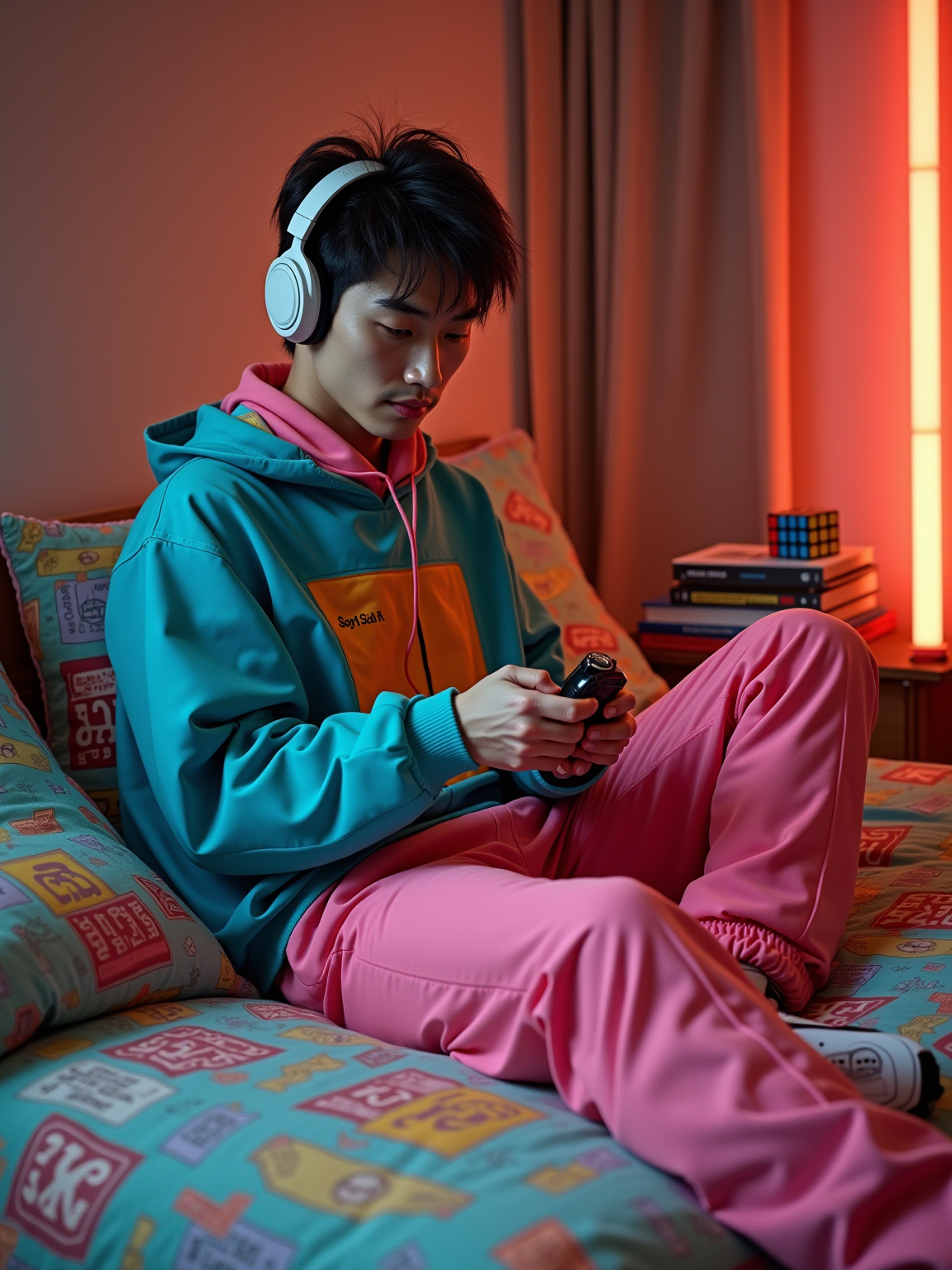 model sitting on a bed covered with geometric neon patterned sheets, wearing Members Only jacket and parachute pants, holding a Sony Walkman with foam headphones, stack of cassette tapes nearby, Rubik's cube on nightstand