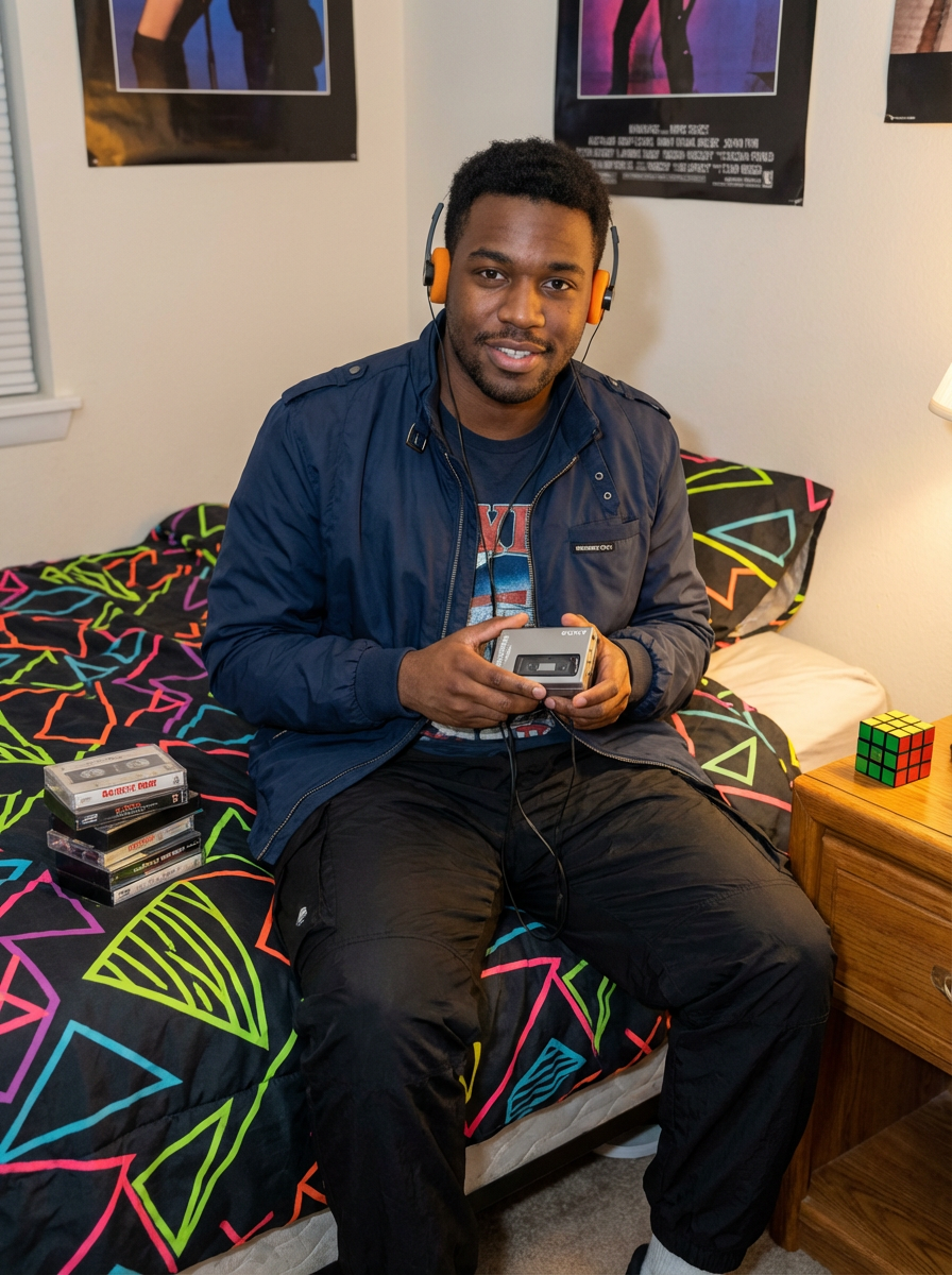 model sitting on a bed covered with geometric neon patterned sheets, wearing Members Only jacket and parachute pants, holding a Sony Walkman with foam headphones, stack of cassette tapes nearby, Rubik's cube on nightstand