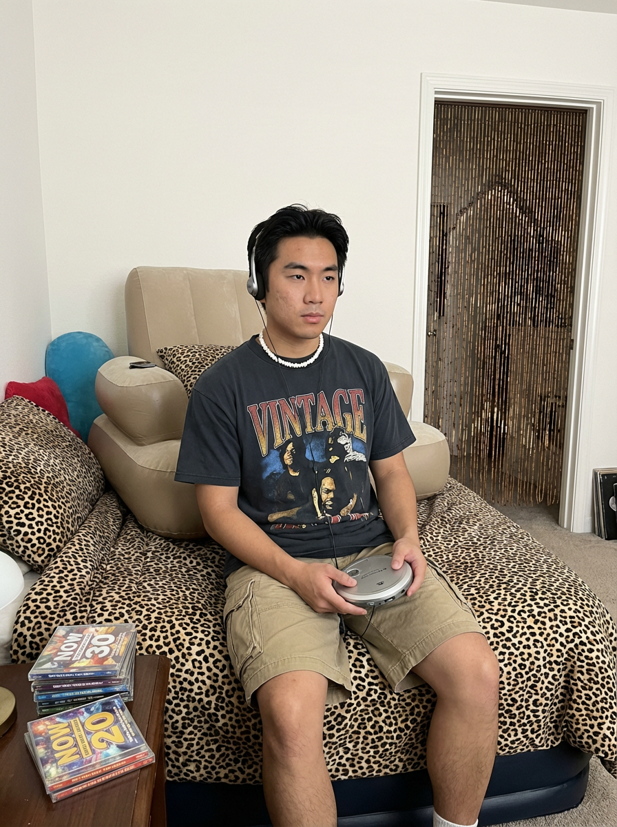 model sitting on a bed covered with inflatable furniture and leopard print bedding, wearing a graphic tee with cargo shorts and shell necklace, holding a portable CD player with foam headphones, stack of Now CDs nearby, beaded door curtain hanging in doorway