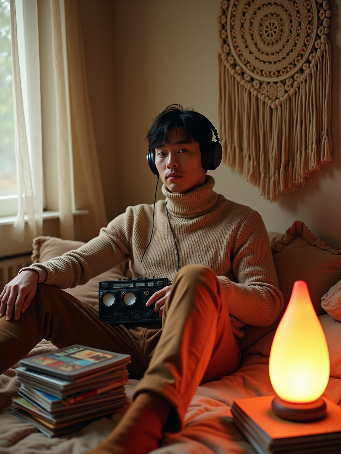 model sitting on a bed covered with macramé wall hangings and earth-tone bedding, wearing a turtleneck sweater with corduroy pants and suede boots, holding a portable 8-track player with large headphones, stack of vinyl albums nearby, lava lamp bubbling in the corner
