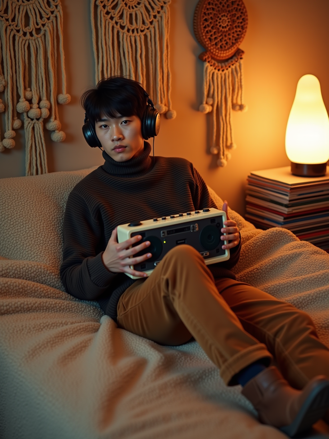 model sitting on a bed covered with macramé wall hangings and earth-tone bedding, wearing a turtleneck sweater with corduroy pants and suede boots, holding a portable 8-track player with large headphones, stack of vinyl albums nearby, lava lamp bubbling in the corner