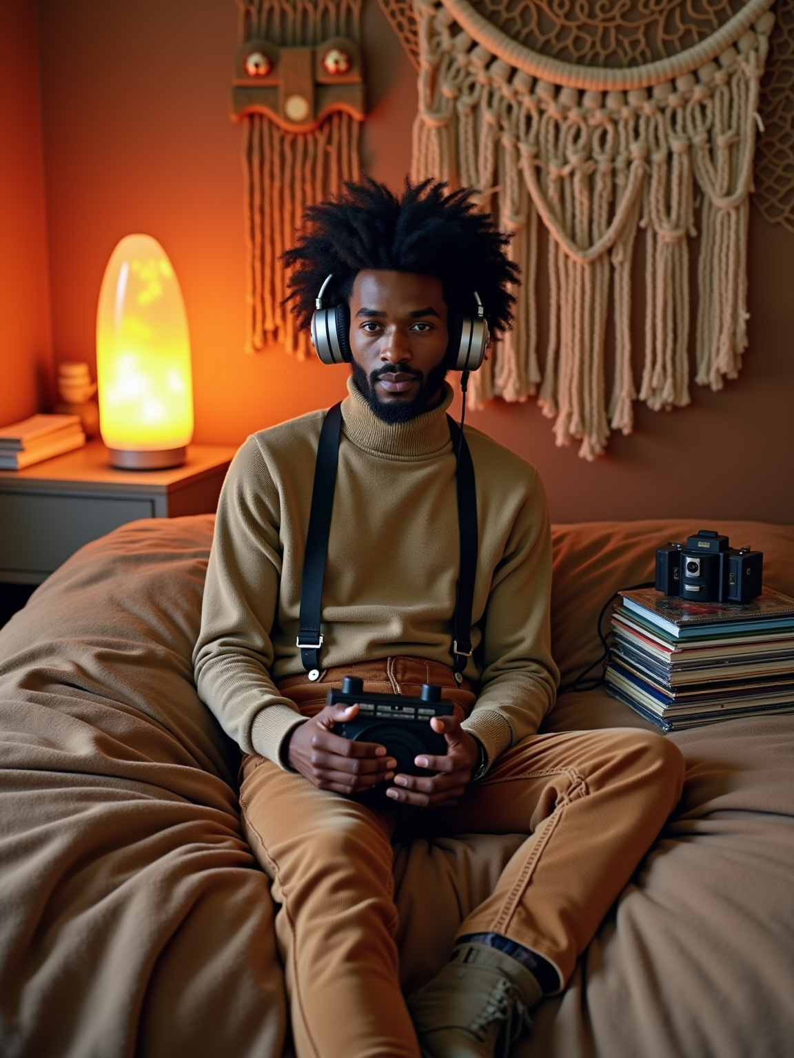 model sitting on a bed covered with macramé wall hangings and earth-tone bedding, wearing a turtleneck sweater with corduroy pants and suede boots, holding a portable 8-track player with large headphones, stack of vinyl albums nearby, lava lamp bubbling in the corner