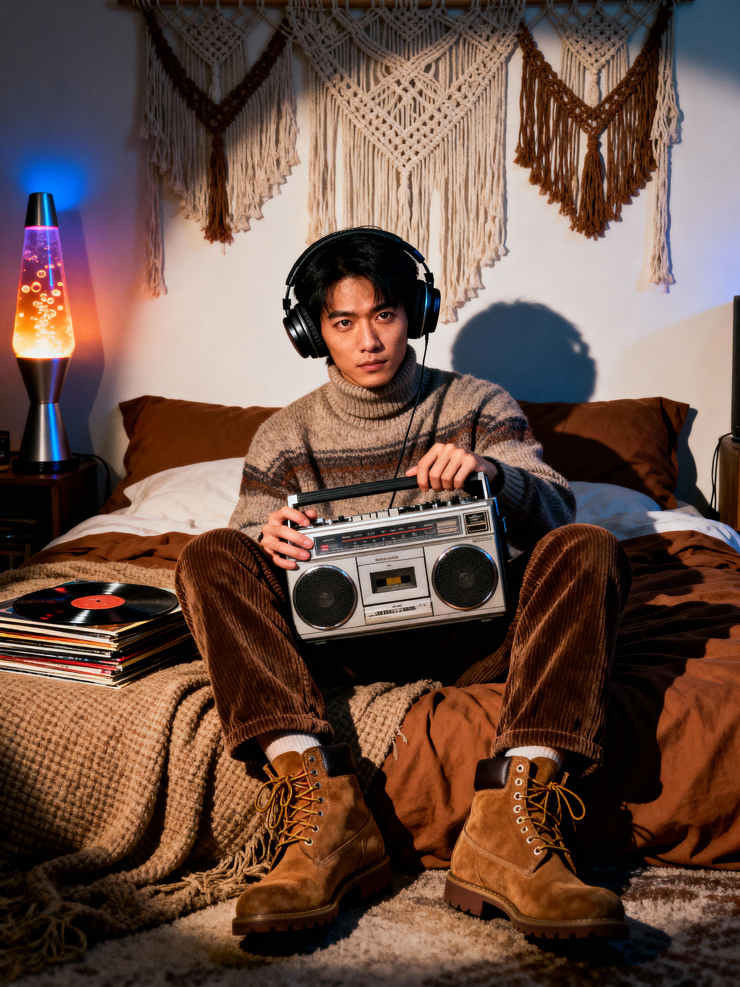 model sitting on a bed covered with macramé wall hangings and earth-tone bedding, wearing a turtleneck sweater with corduroy pants and suede boots, holding a portable 8-track player with large headphones, stack of vinyl albums nearby, lava lamp bubbling in the corner