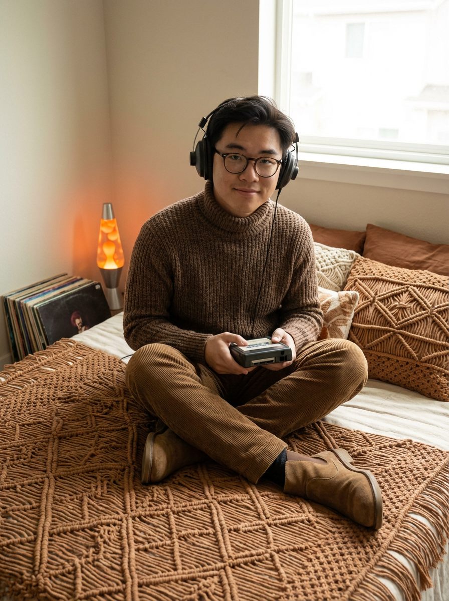 model sitting on a bed covered with macramé wall hangings and earth-tone bedding, wearing a turtleneck sweater with corduroy pants and suede boots, holding a portable 8-track player with large headphones, stack of vinyl albums nearby, lava lamp bubbling in the corner