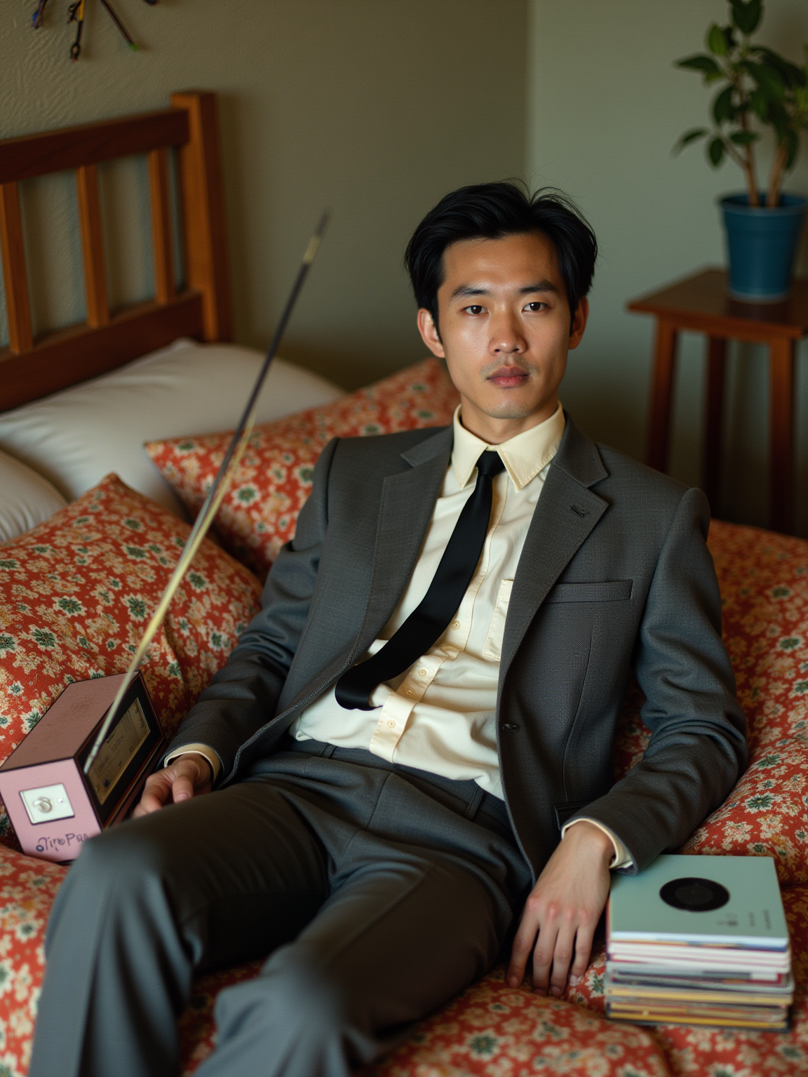 model sitting on a bed covered with paisley print bedding and throw pillows, wearing a button-down shirt with narrow tie and mod suit jacket, holding a transistor radio with extendable antenna, stack of 45 RPM records nearby, peace sign mobile hanging from ceiling