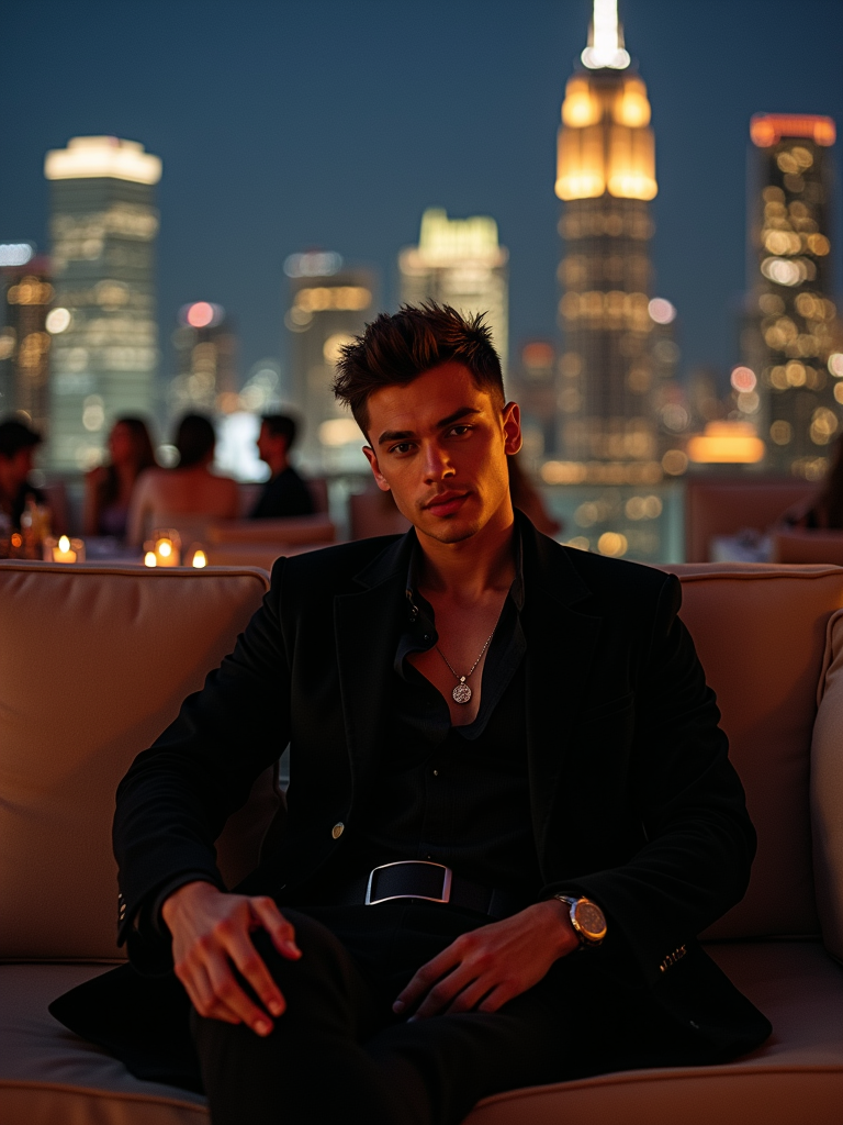 model sitting on an elegant outdoor couch in a luxurious setting. model is wearing a stylish black outfit. The backdrop features a stunning city skyline at night, with brightly lit skyscrapers creating a sophisticated ambiance. The scene suggests an upscale lounge or rooftop setting, with ambient lighting and other patrons visible in the background. The overall vibe is relaxed yet classy, emphasizing luxury and exclusivity.
