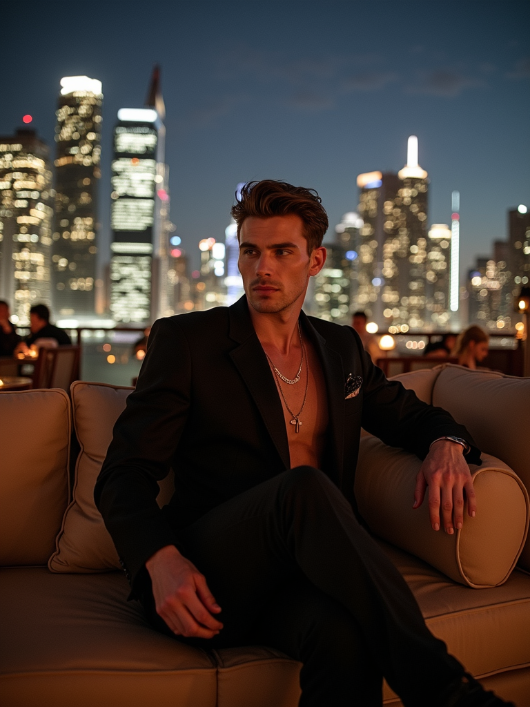 model sitting on an elegant outdoor couch in a luxurious setting. model is wearing a stylish black outfit. The backdrop features a stunning city skyline at night, with brightly lit skyscrapers creating a sophisticated ambiance. The scene suggests an upscale lounge or rooftop setting, with ambient lighting and other patrons visible in the background. The overall vibe is relaxed yet classy, emphasizing luxury and exclusivity.