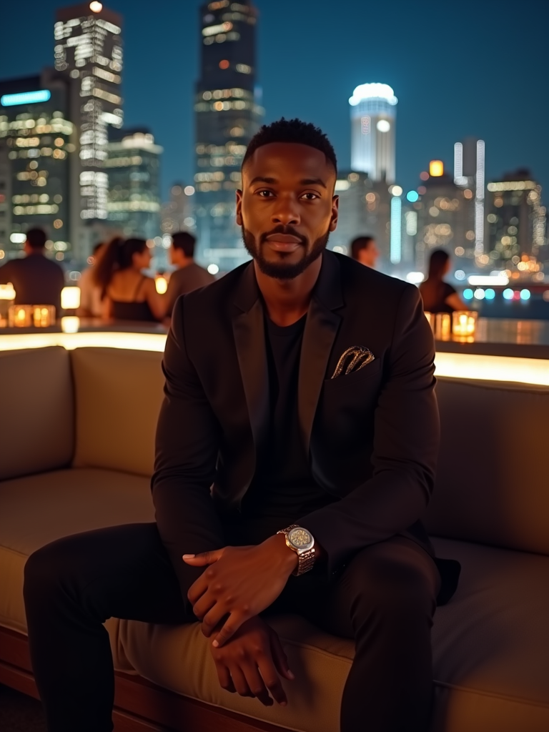 model sitting on an elegant outdoor couch in a luxurious setting. model is wearing a stylish black outfit. The backdrop features a stunning city skyline at night, with brightly lit skyscrapers creating a sophisticated ambiance. The scene suggests an upscale lounge or rooftop setting, with ambient lighting and other patrons visible in the background. The overall vibe is relaxed yet classy, emphasizing luxury and exclusivity.