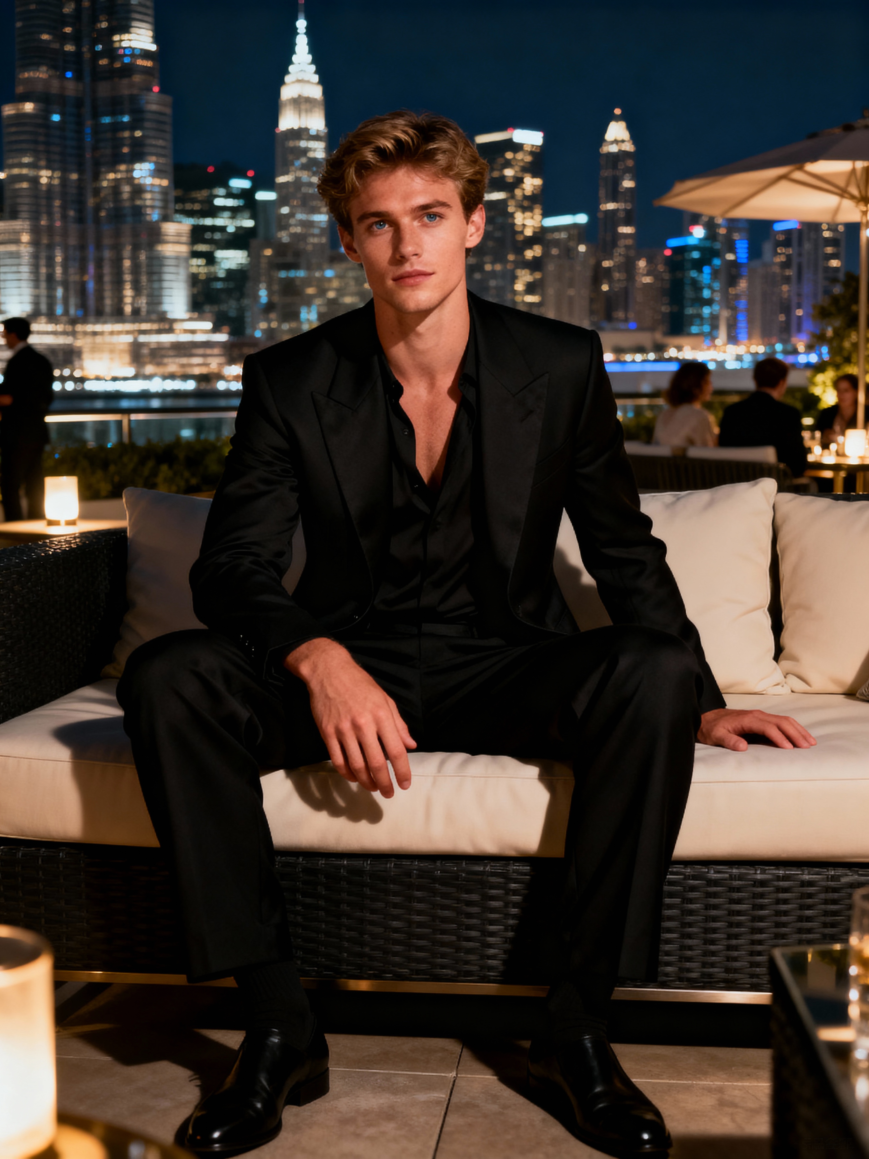 model sitting on an elegant outdoor couch in a luxurious setting. model is wearing a stylish black outfit. The backdrop features a stunning city skyline at night, with brightly lit skyscrapers creating a sophisticated ambiance. The scene suggests an upscale lounge or rooftop setting, with ambient lighting and other patrons visible in the background. The overall vibe is relaxed yet classy, emphasizing luxury and exclusivity.