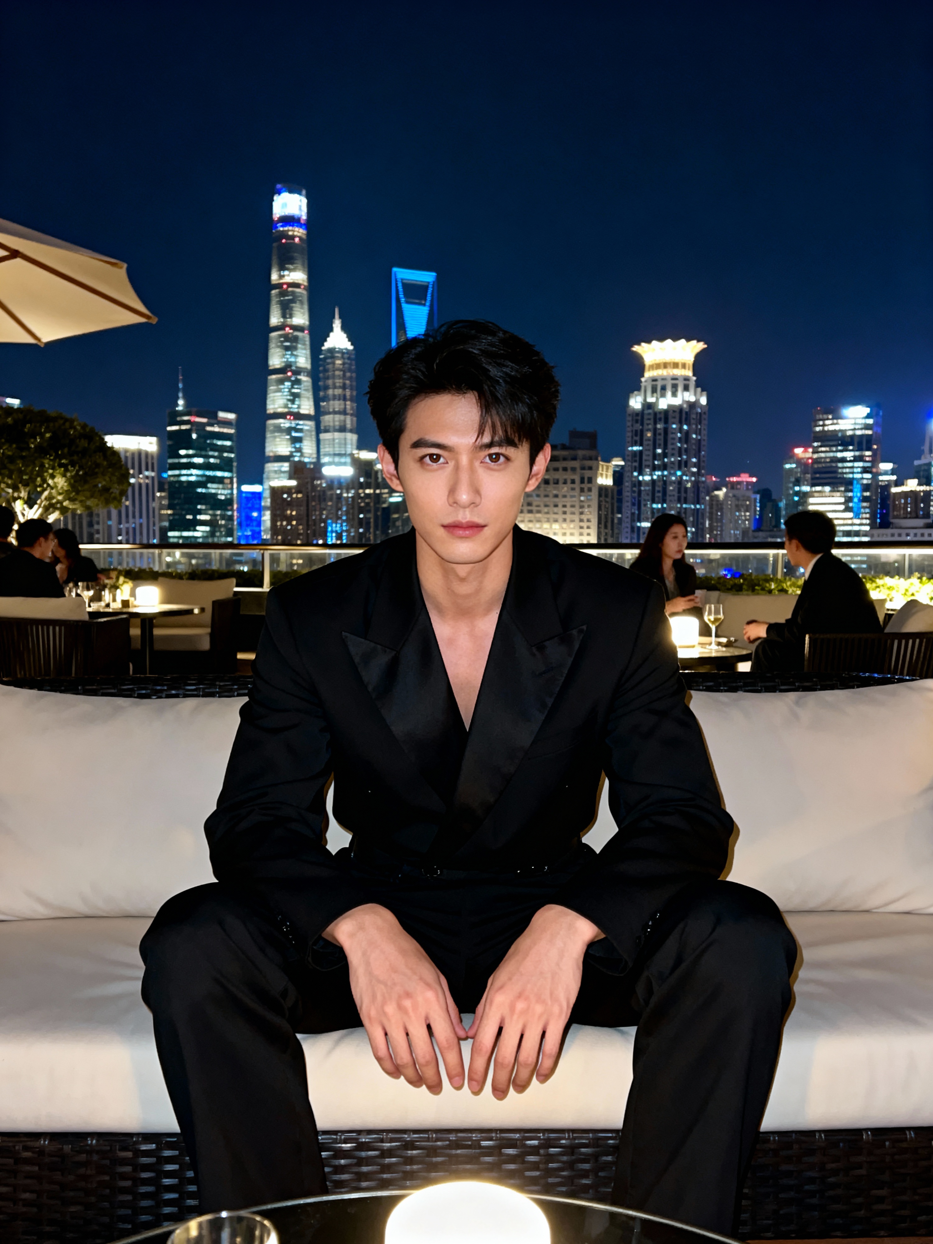 model sitting on an elegant outdoor couch in a luxurious setting. model is wearing a stylish black outfit. The backdrop features a stunning city skyline at night, with brightly lit skyscrapers creating a sophisticated ambiance. The scene suggests an upscale lounge or rooftop setting, with ambient lighting and other patrons visible in the background. The overall vibe is relaxed yet classy, emphasizing luxury and exclusivity.