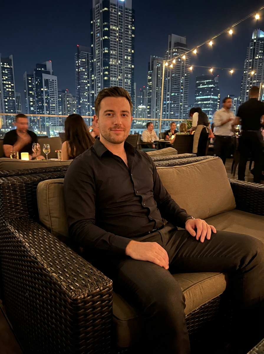 model sitting on an elegant outdoor couch in a luxurious setting. model is wearing a stylish black outfit. The backdrop features a stunning city skyline at night, with brightly lit skyscrapers creating a sophisticated ambiance. The scene suggests an upscale lounge or rooftop setting, with ambient lighting and other patrons visible in the background. The overall vibe is relaxed yet classy, emphasizing luxury and exclusivity.