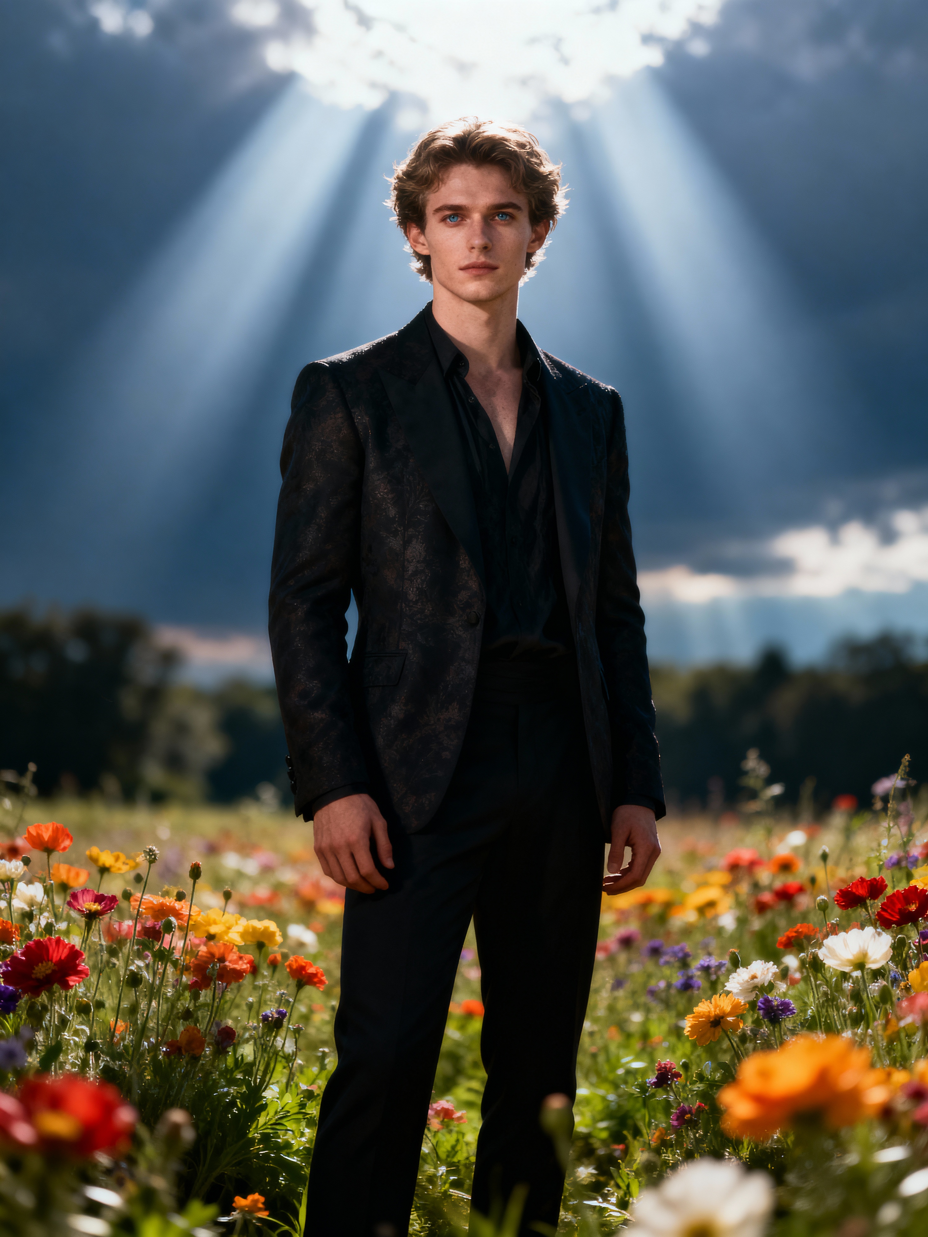 model | standing in field full of flowers | detailed gorgeous face! ! | full body! ! | god rays | intricate | elegant | realistic | hyperrealistic | cinematic | character design | concept art | illustration | digital art | digital painting | depth of field