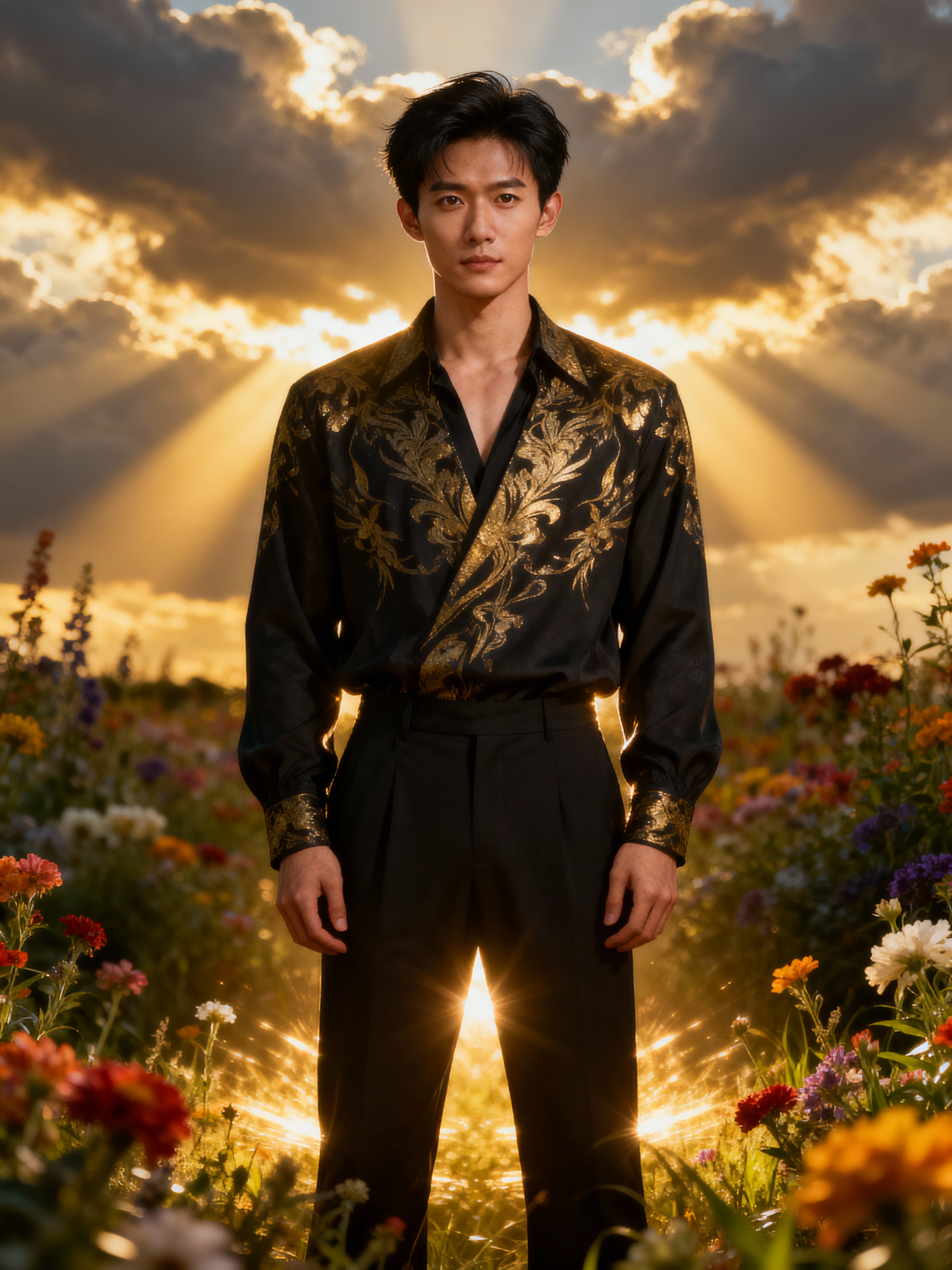 model | standing in field full of flowers | detailed gorgeous face! ! | full body! ! | god rays | intricate | elegant | realistic | hyperrealistic | cinematic | character design | concept art | illustration | digital art | digital painting | depth of field