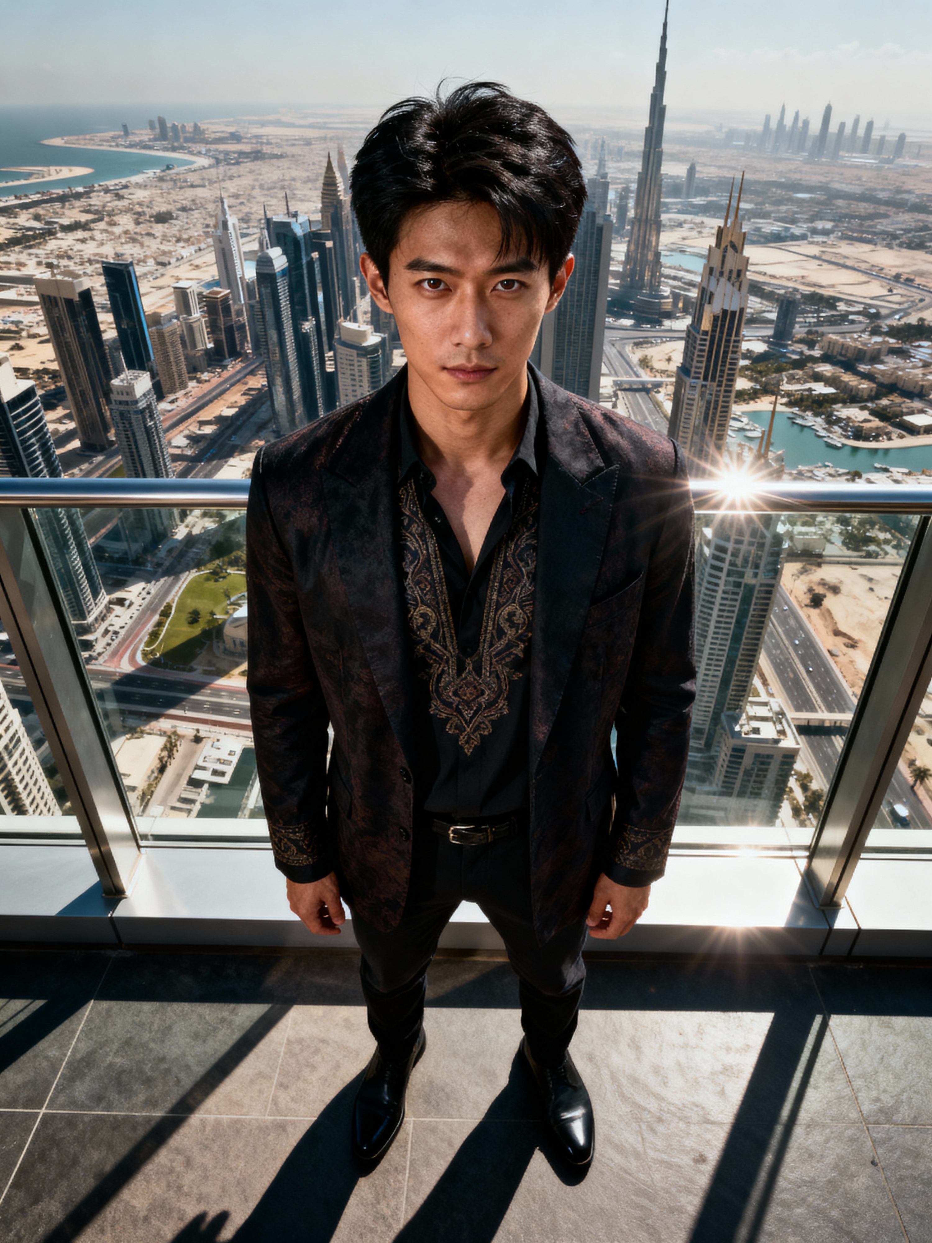 model standing in front of city skyline viewpoint in Dubai with city skyline in background
