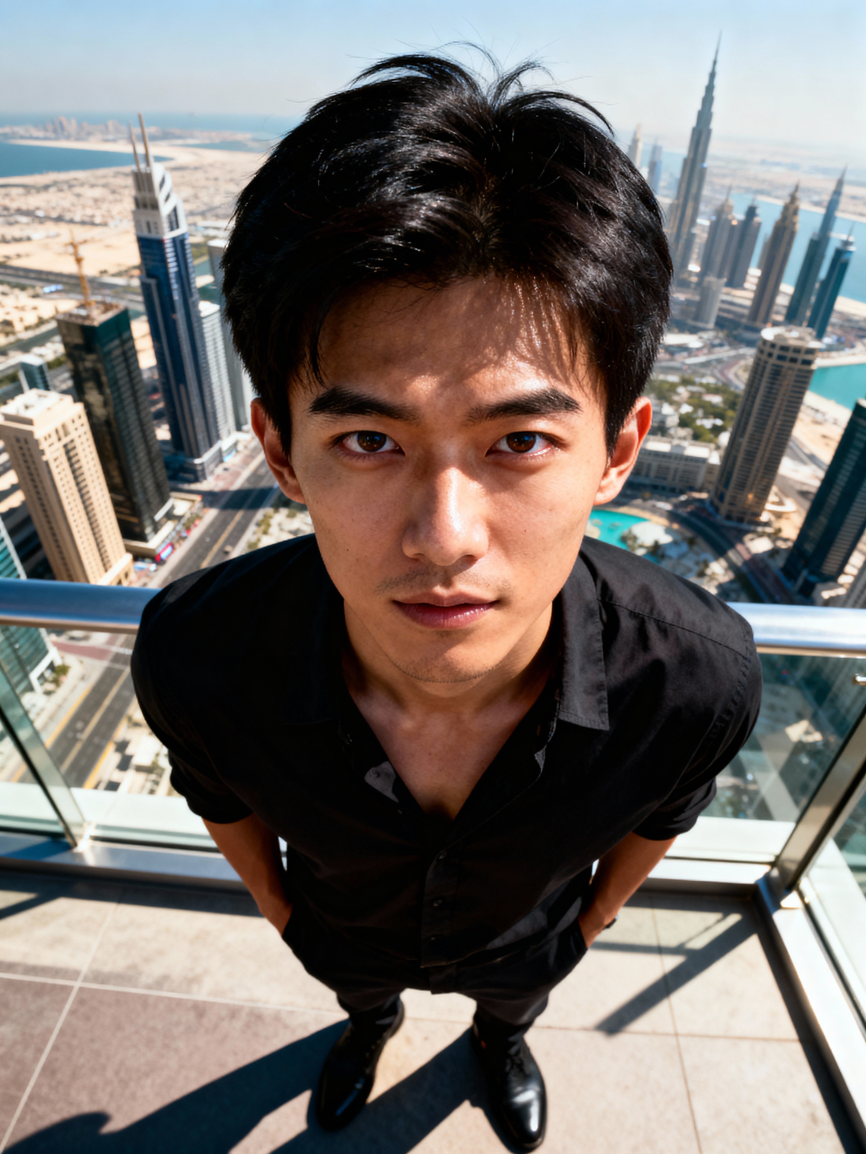 model standing in front of city skyline viewpoint in Dubai with city skyline in background
