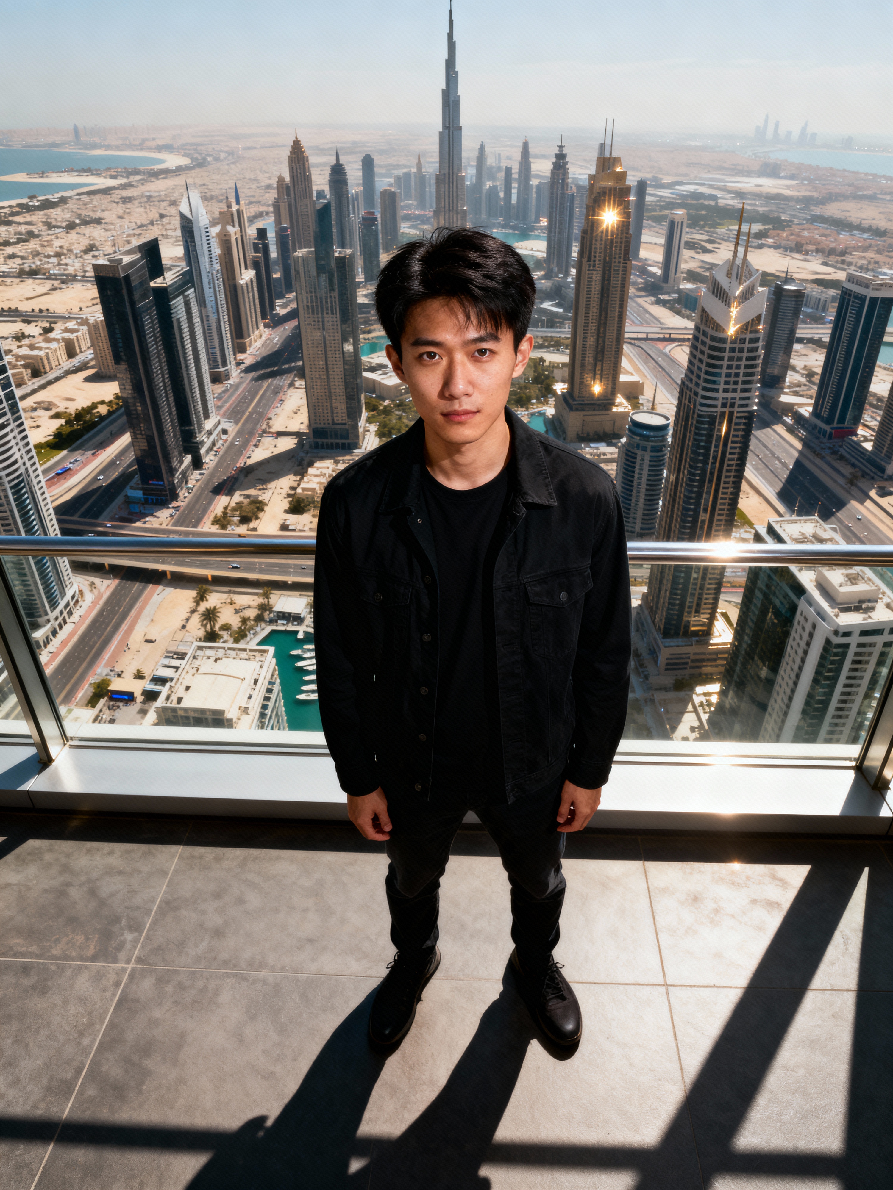model standing in front of city skyline viewpoint in Dubai with city skyline in background
