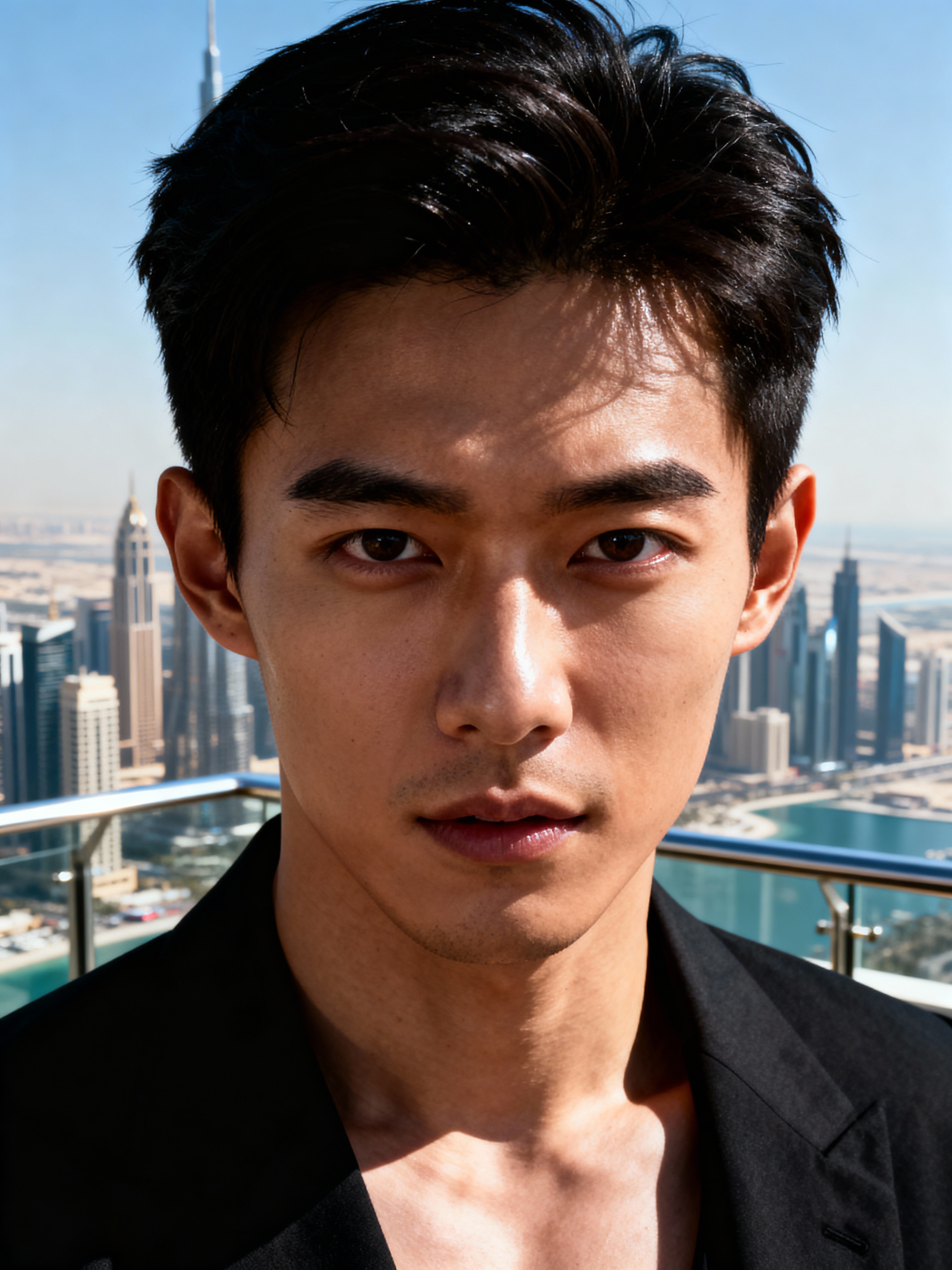 model standing in front of city skyline viewpoint in Dubai with city skyline in background