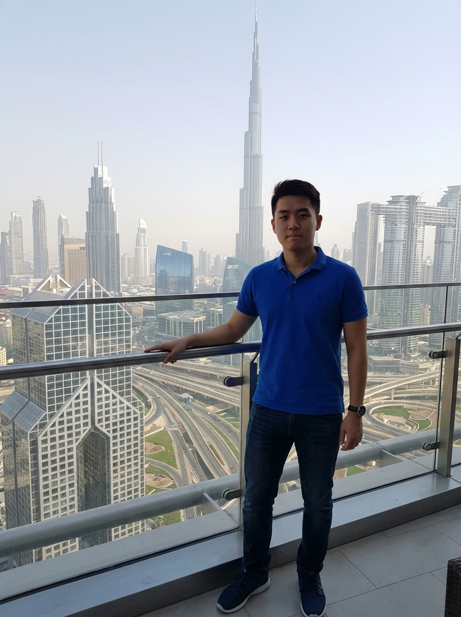 model standing in front of city skyline viewpoint in Dubai with city skyline in background