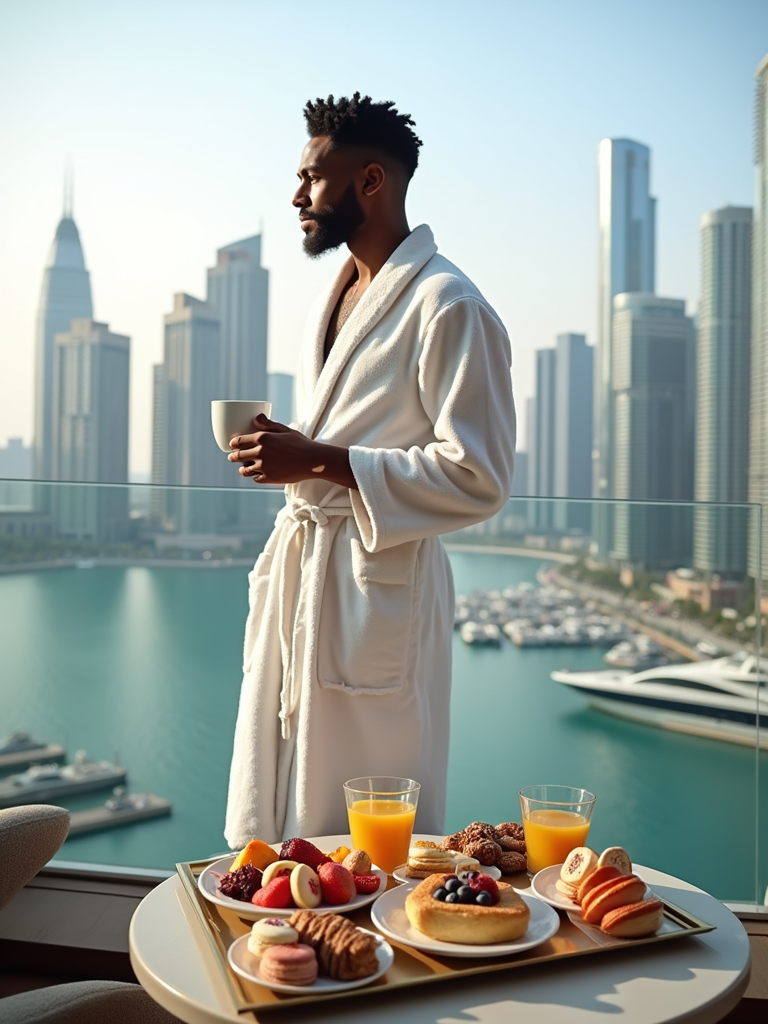 model standing on a luxurious balcony, overlooking a vibrant marina and modern skyscrapers. The model is wearing a white robe with neatly styled hair, holding a coffee cup in one hand. A lavish breakfast tray with fresh pastries, colorful fruits, macarons, and beverages is elegantly set on a table in the foreground. The atmosphere is serene, with soft daylight enhancing the opulent cityscape and indulgent setting