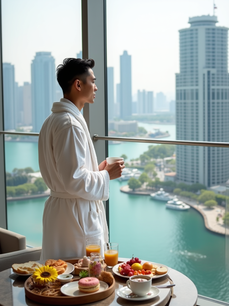 model standing on a luxurious balcony, overlooking a vibrant marina and modern skyscrapers. The model is wearing a white robe with neatly styled hair, holding a coffee cup in one hand. A lavish breakfast tray with fresh pastries, colorful fruits, macarons, and beverages is elegantly set on a table in the foreground. The atmosphere is serene, with soft daylight enhancing the opulent cityscape and indulgent setting