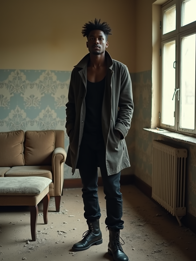 model stands in a decayed Soviet living room, worn furniture, peeling wallpaper, wearing a dusty coat, sunlight filtering through cracked windows. wearing black boots and black pants and black tank top.