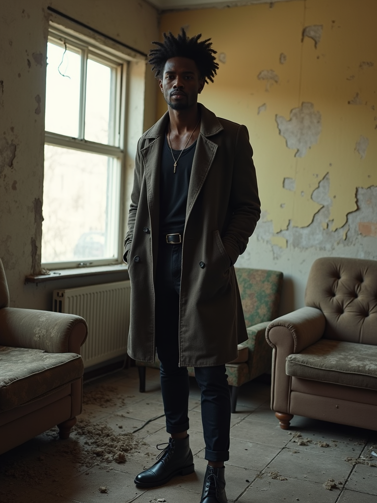 model stands in a decayed Soviet living room, worn furniture, peeling wallpaper, wearing a dusty coat, sunlight filtering through cracked windows. wearing black boots and black pants and black tank top.